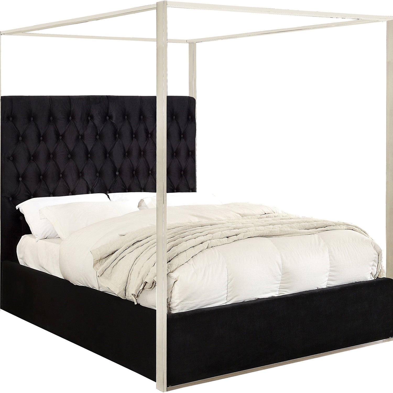 Meridian Furniture Porter Collection Modern | Contemporary Velvet Upholstered Bed with Deep Detailed Tufting and Chrome Canopy, Black, Queen