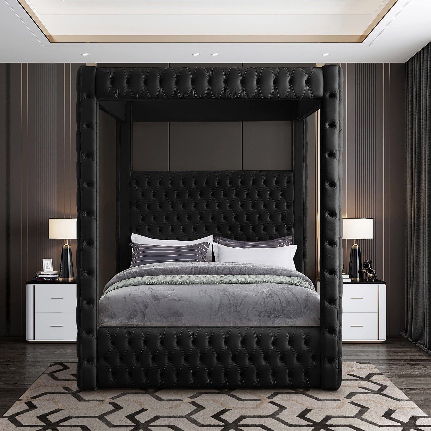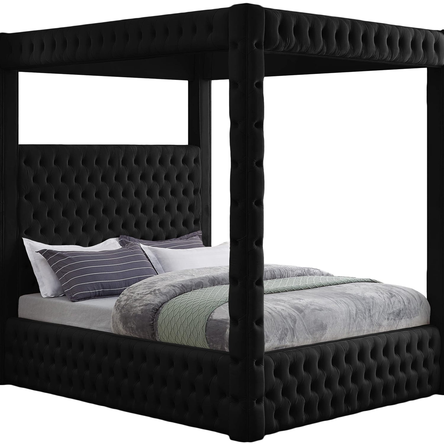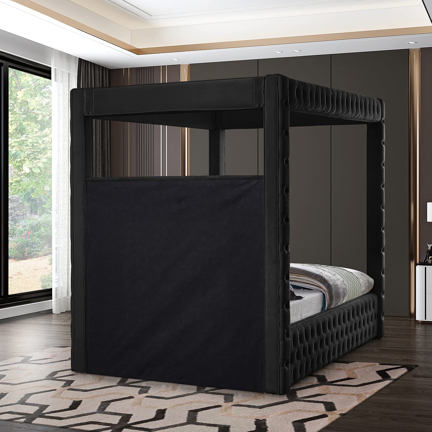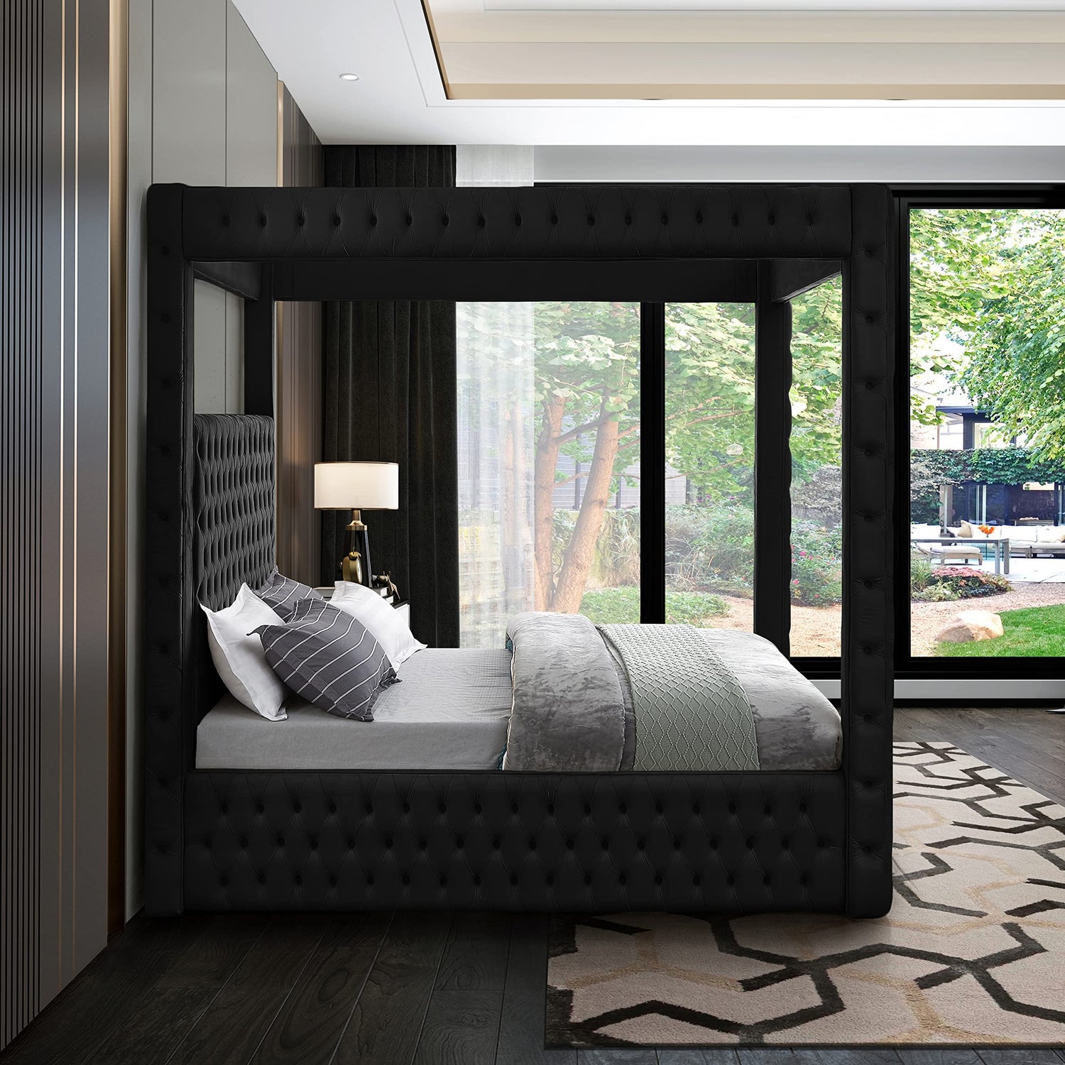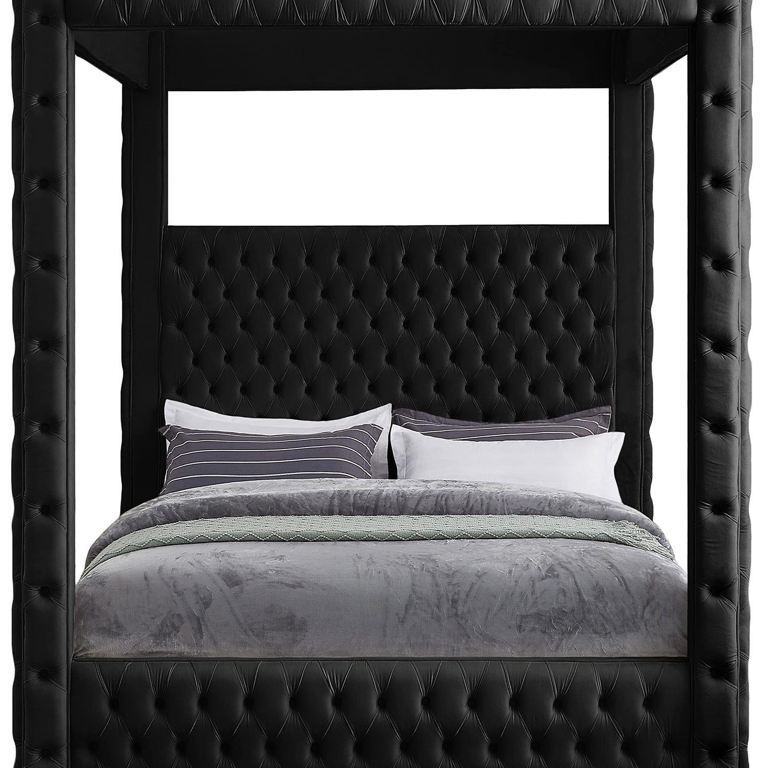 Meridian Furniture RoyalBlack-K Royal Collection Modern | Contemporary Velvet Upholstered King Bed with Soft Black Velvet, Deep Elegant Tufting, Canopy, 86.5" W x 89" D x 87" H, Black, King