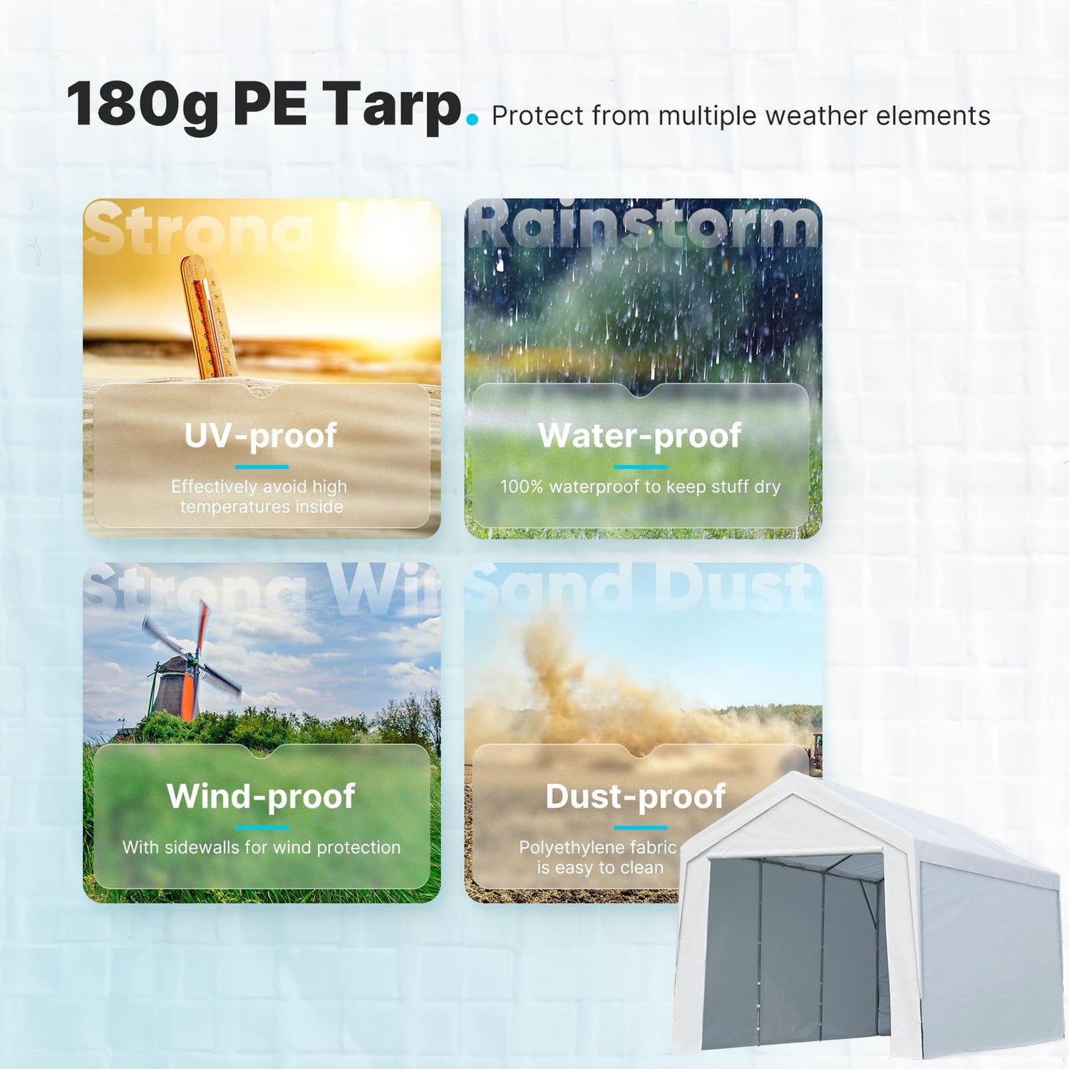 • 【Waterproof Canopy Cover】-This car canopy is made of heat-sealed, triple-layer 180g polyethylene fabric, which is Anti-UV, waterproof, tear-proof, and can protect your car or boats against all four season elements, like sun, wind, rain, dust, hail, and snow.