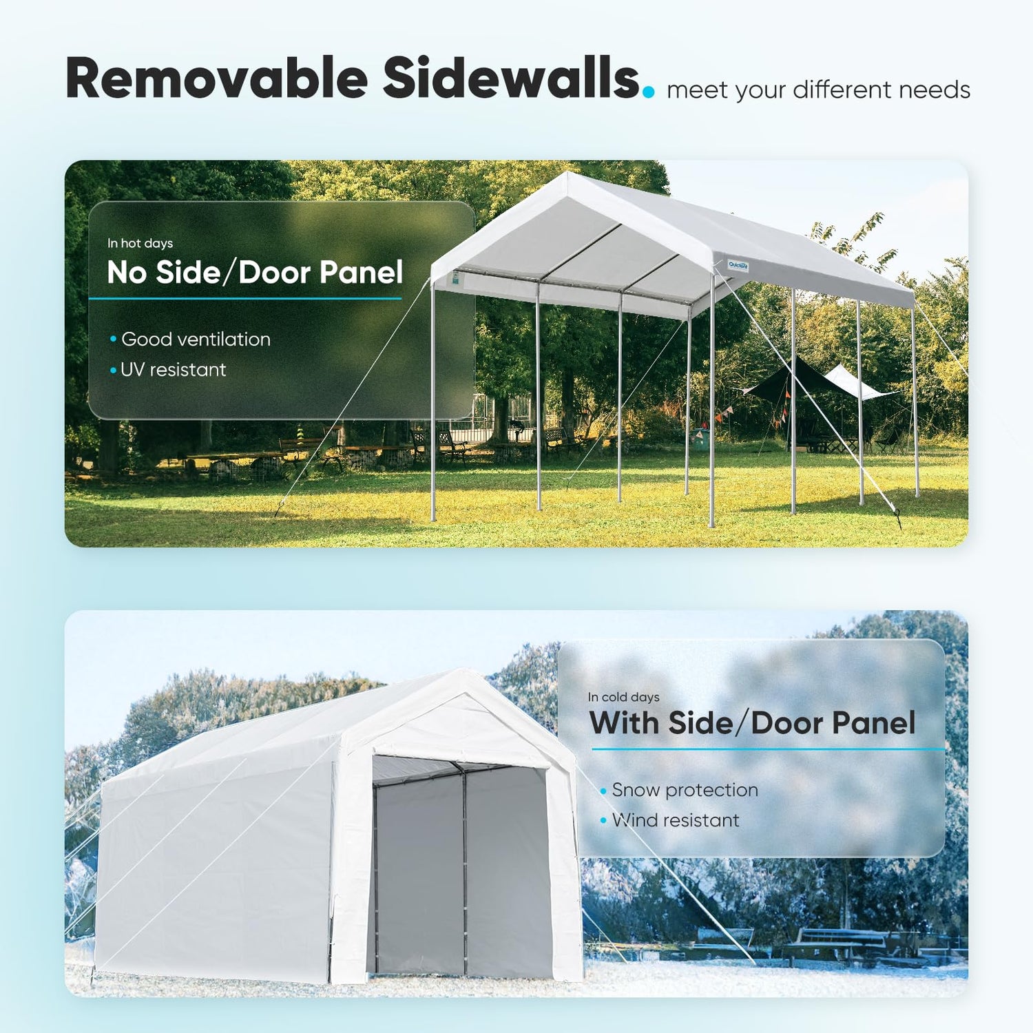 • 【Removable Sidewalls and Doors】- This carport shelter has 2 removable sidewalls and two removable doors with zippers. You can roll the doors up or down when needed. You can also remove all the sidewalls and doors, only leave the canopy cover on for outdoor activities.