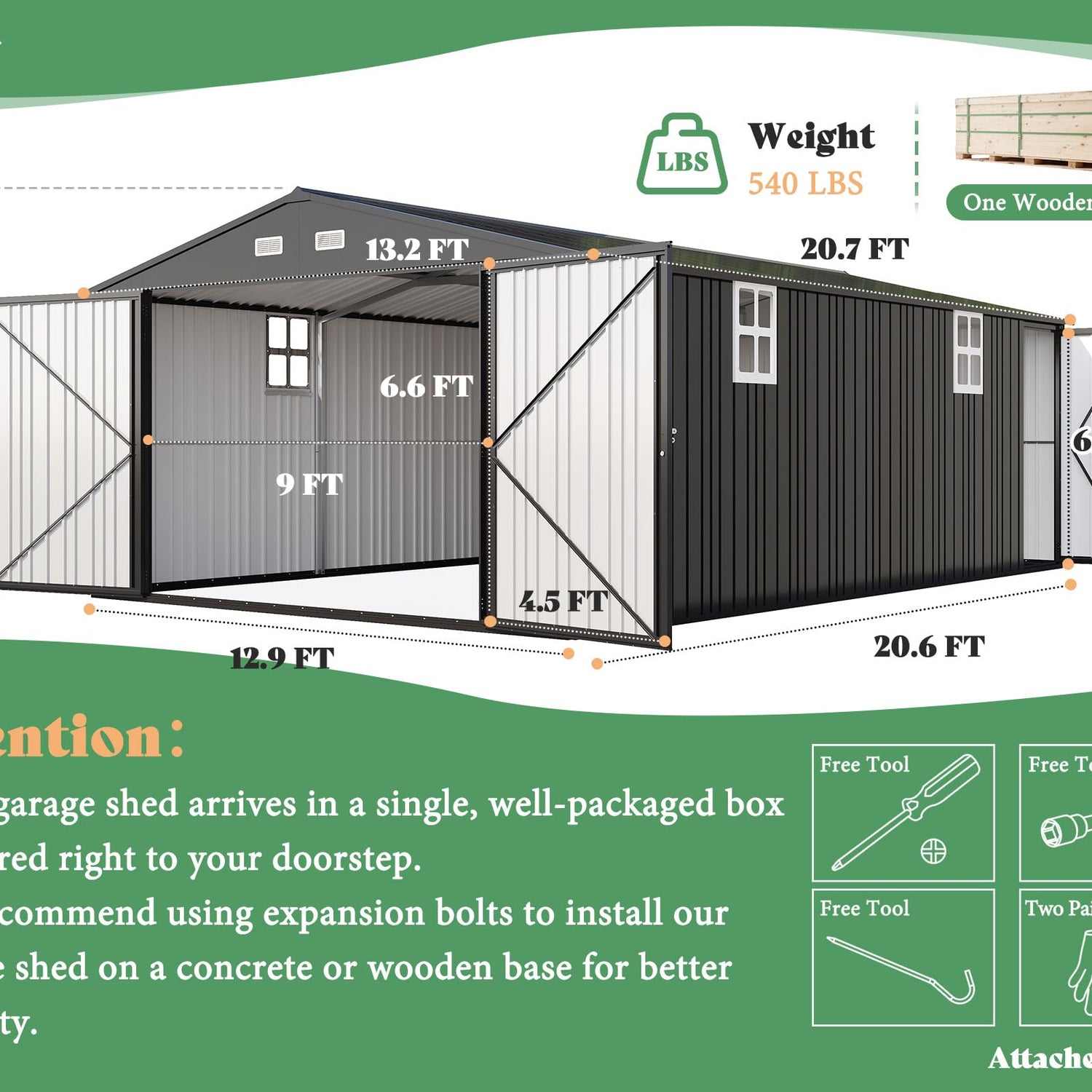 - 13.2x21x8.4 FT Extra Huge Storage Shed: This shed offers an impressive 1750 cu.ft of storage space, perfect for accommodating cars, large tools, and equipment. Recommended to build a 14x22 FT foundation for it