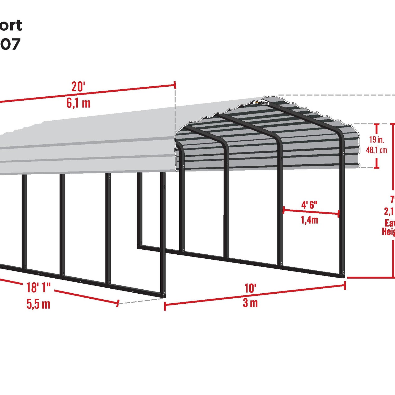 - DIMENSIONS: The fully assembled Arrow Sheds steel carport measures 120" W x 237" D x 98.4" H, or 10' W x 20' D x 7' H; this unit contains 5 packages: you will receive 3 frame cartons and 2 roof panel cartons