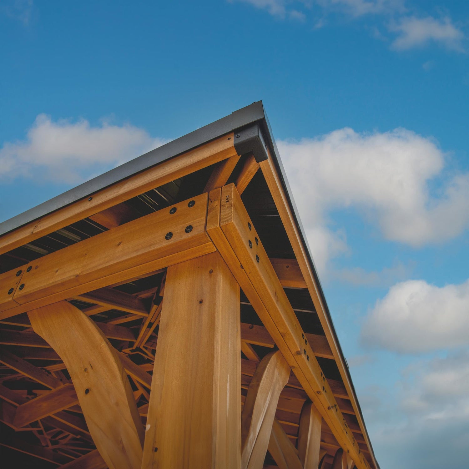 Details: Meet the Barrington Gazebo from Backyard Discovery and transform your outdoor area into the perfect sanctuary. The heavy-gauge galvanized steel hip roof combines classic style with durable construction, providing protection from rain, snow, and sun. Designed for exceptional stability and resilience, this wooden gazebo is Pro-Tect tested and proven to withstand up to 15,700 pounds or 30 inches of snow, and 100 mph winds*. The pre-stained finish adds a charming aesthetic while the beautiful cedar wood frame is resistant to rot and decay, ensuring the Barrington is a long-lasting addition to your backyard. With our exclusive PowerPort electrical outlets and USB ports, it's easy to play music, charge your devices, and add ambient lighting to create the perfect setting. This versatile outdoor gazebo is perfect for enhancing any backyard while easily accommodating comfortable furniture and decorative elements to match your style. Whether you're seeking a private retreat, a dedicated outdoor space for yoga or exercise, or a charming venue for backyard parties, the Barrington patio gazebo adapts effortlessly to your needs. Assembly is streamlined with pre-cut, pre-stained, and pre-drilled components, while the interactive BILT app provides step-by-step guidance. Bring the Barrington Gazebo home today and create your dream backyard sanctuary.