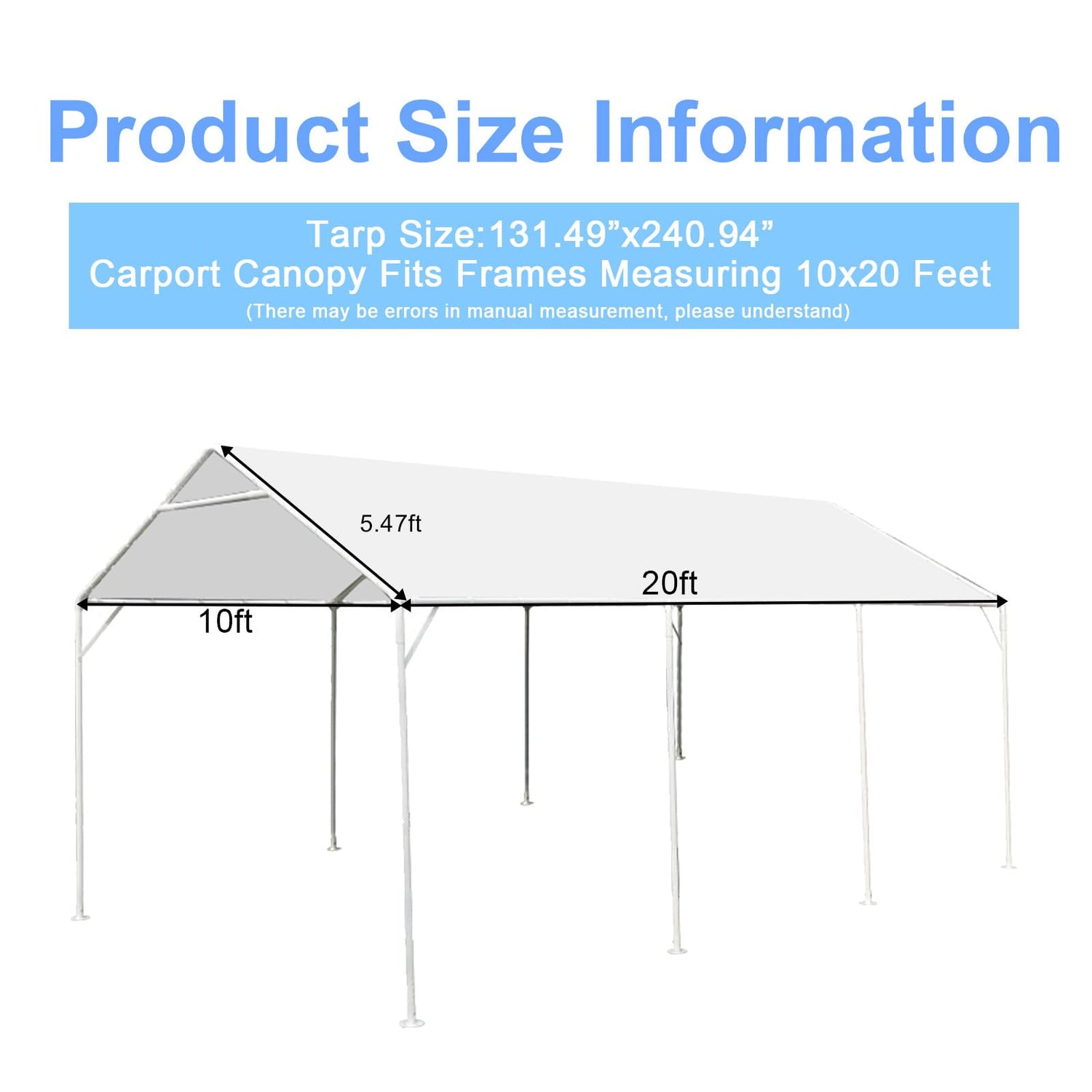 • 10 x 20 FT Canopy:The carport cover displays a considerable length of about 236.22 inches and a width measuring roughly 126.77 inches, fits for most frame in size 10 x 20 ft on market, perfect for outdoor settings, such as in the backyard, at a campground, or a construction site.Please check your carport's size before purchase.