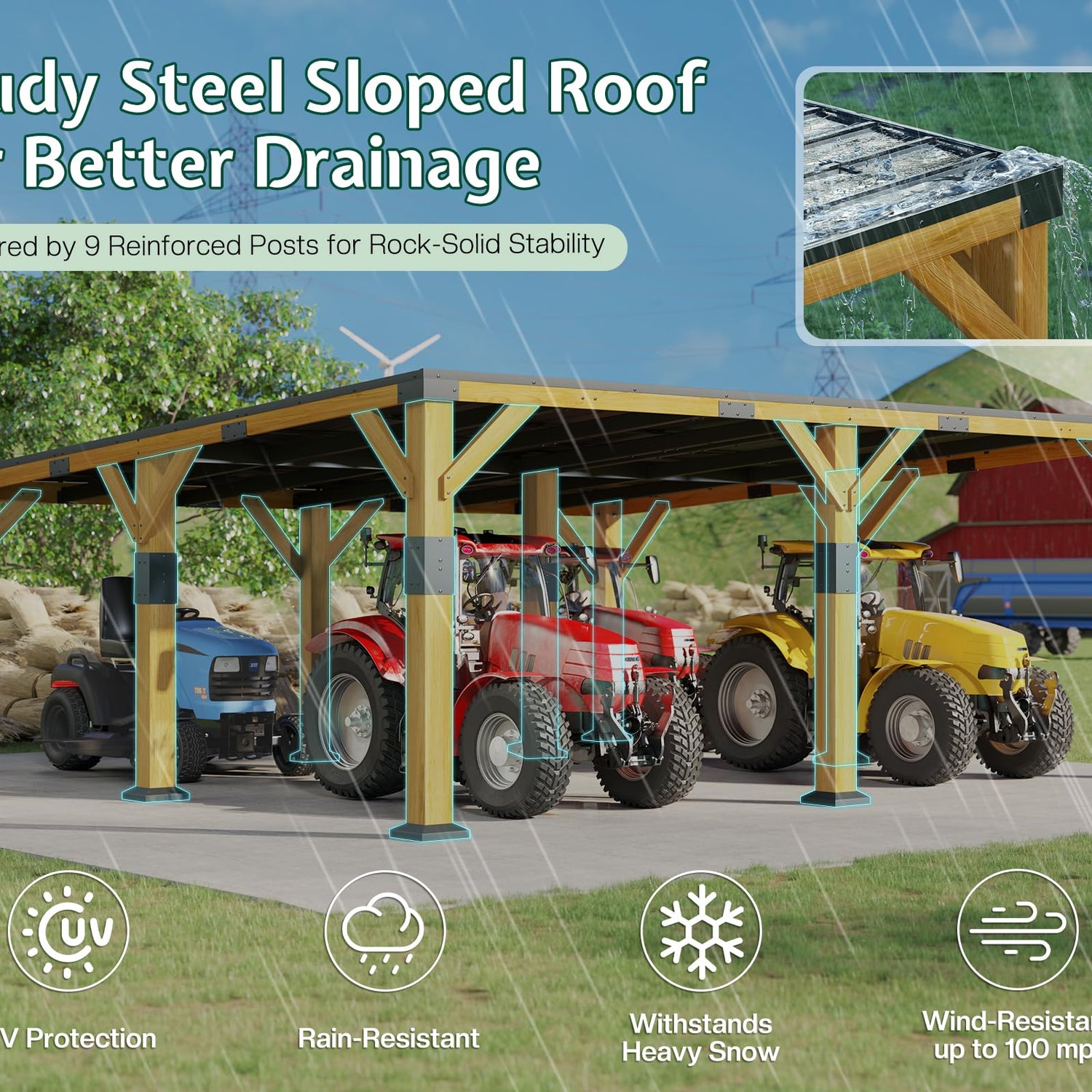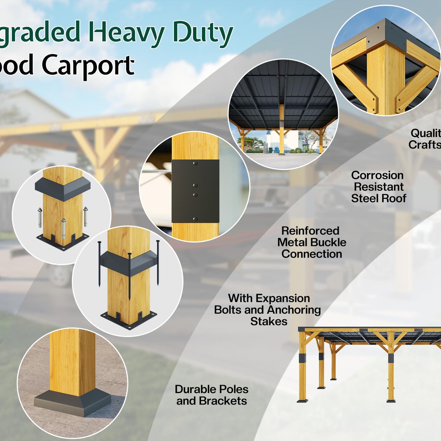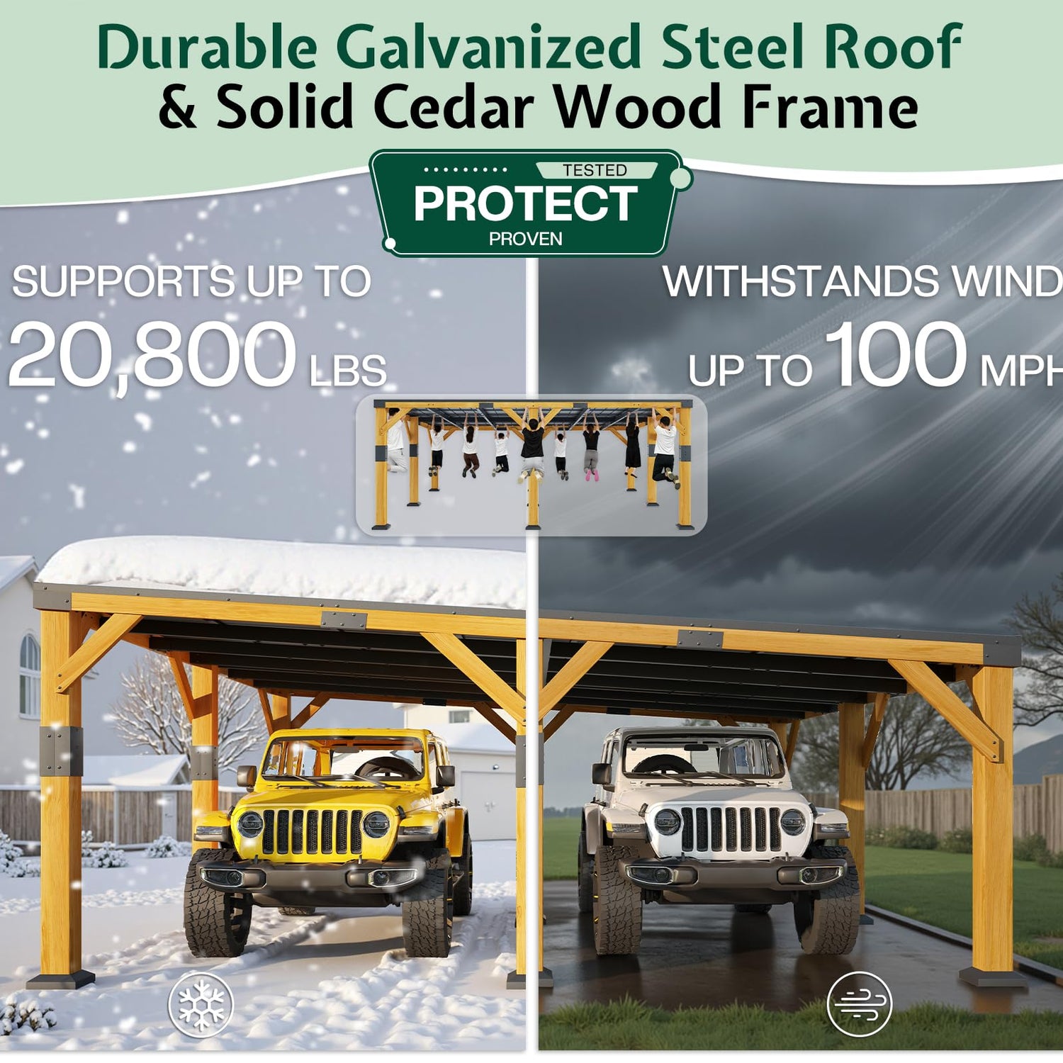 - Built for Extreme Weather Conditions: Constructed with a rust-resistant galvanized steel sloped roof and solid cedar wood frame, this wooden carport withstands winds up to 100 mph and supports 20,800 lbs—delivering year-round protection in all climates