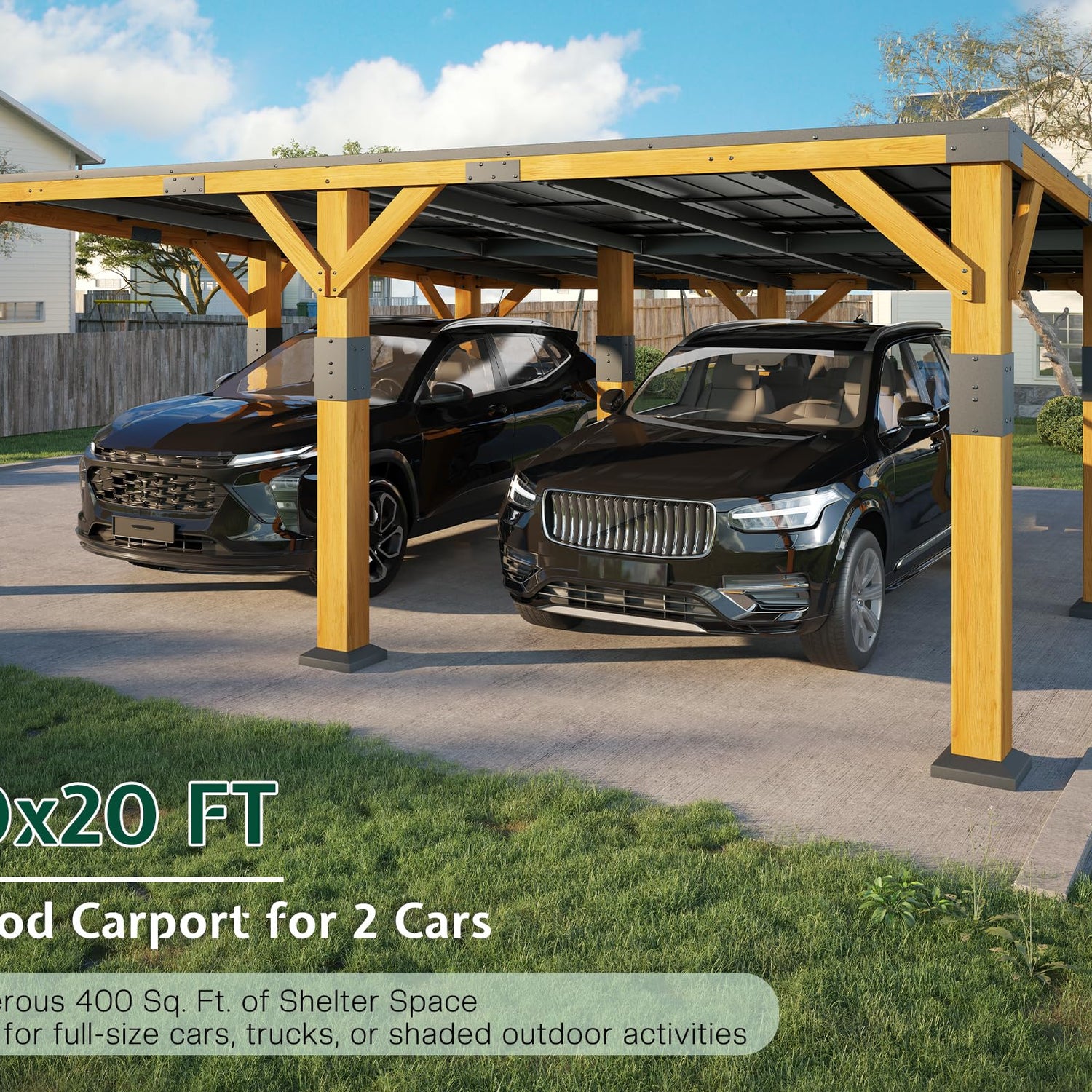 Jocisland 20x20x9.2 FT Cedar Wood Carport with Sloped Galvanized Steel Roof, Heavy Duty Outdoor Shelter for 2 Cars, Trucks, Boats & Tractors, Wind & Snow Resistant Pitch Roof Design