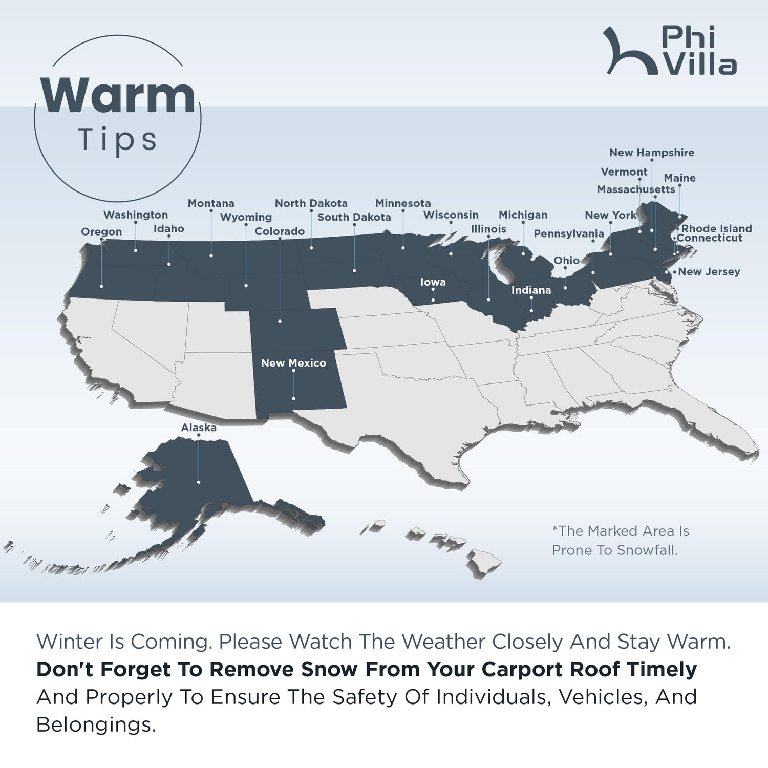 - To ensure that your carport is safe and secure, it is recommended that you clear snow on a reqular basis to avoid the effects of excessive snow on the structure. This not only extends the life of the product, but also keeps your vehicle in good condition at all times.