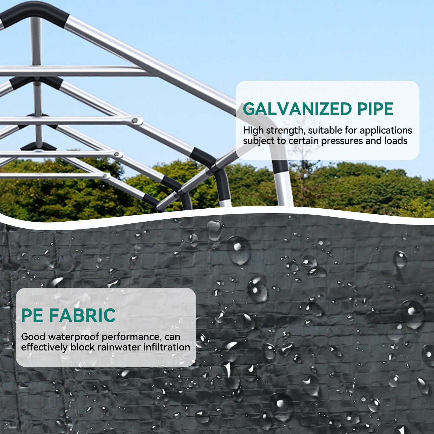 - HEAVY DUTY CAR CARPORT CANOPY: Reinforced PE material is Tear-proof, Waterproof and Anti-UV; Galvanizing process protect steel pipe surface from chipping, peeling, rust and corrosion for long lasting durability and protection guaranteed; providing your vehicles maximum damage protection against sun, rain, snow, dirt, hail and scratches