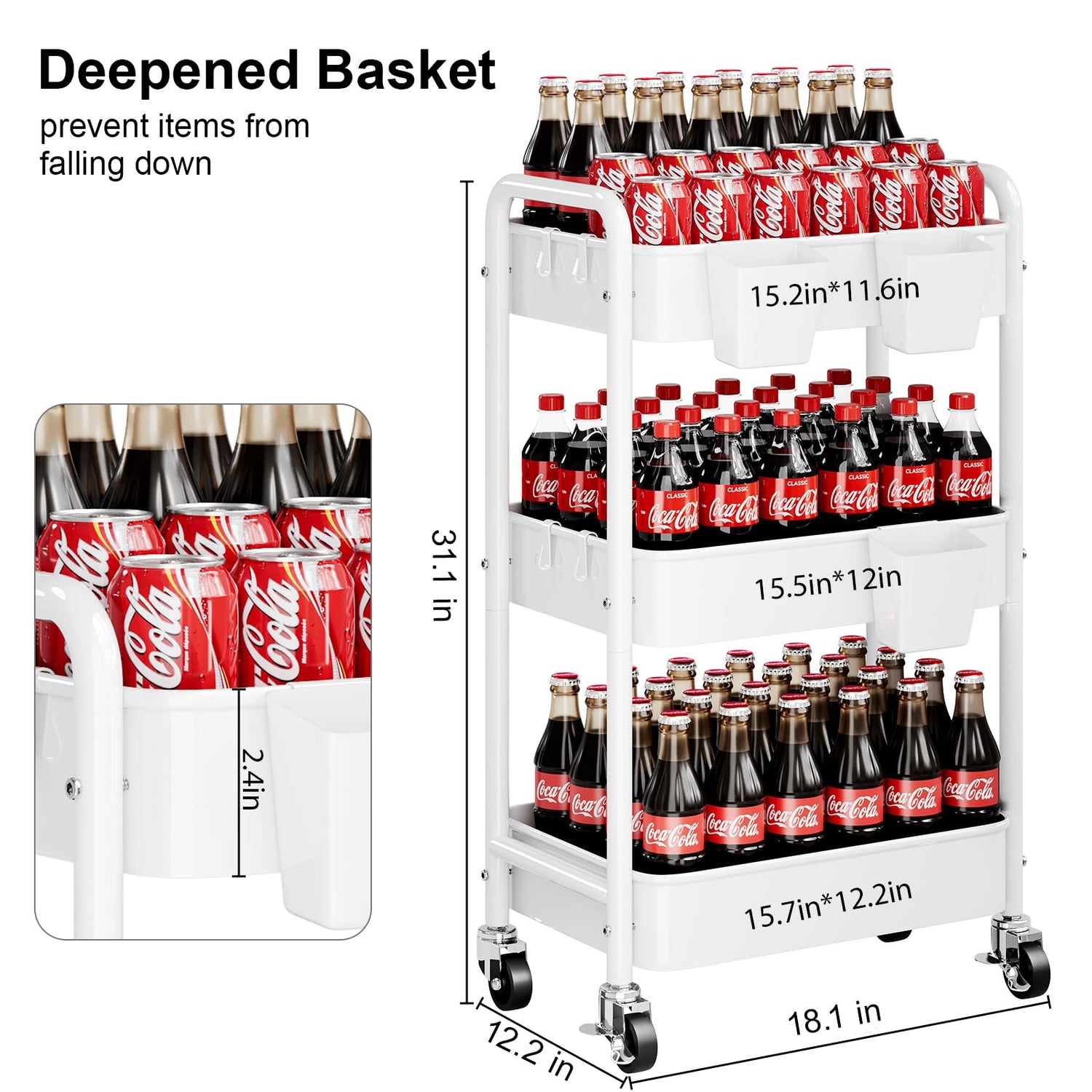 • 【Spacious & Secure Storage】Designed with deep baskets to prevent items from falling, this 3 tier storage cart maximizes storage while optimizing floor space. It includes 3 hanging cups and 4 hooks for additional organized storage of small essentials, making it ideal for pantry items, toiletries, tools, or laundry supplies.