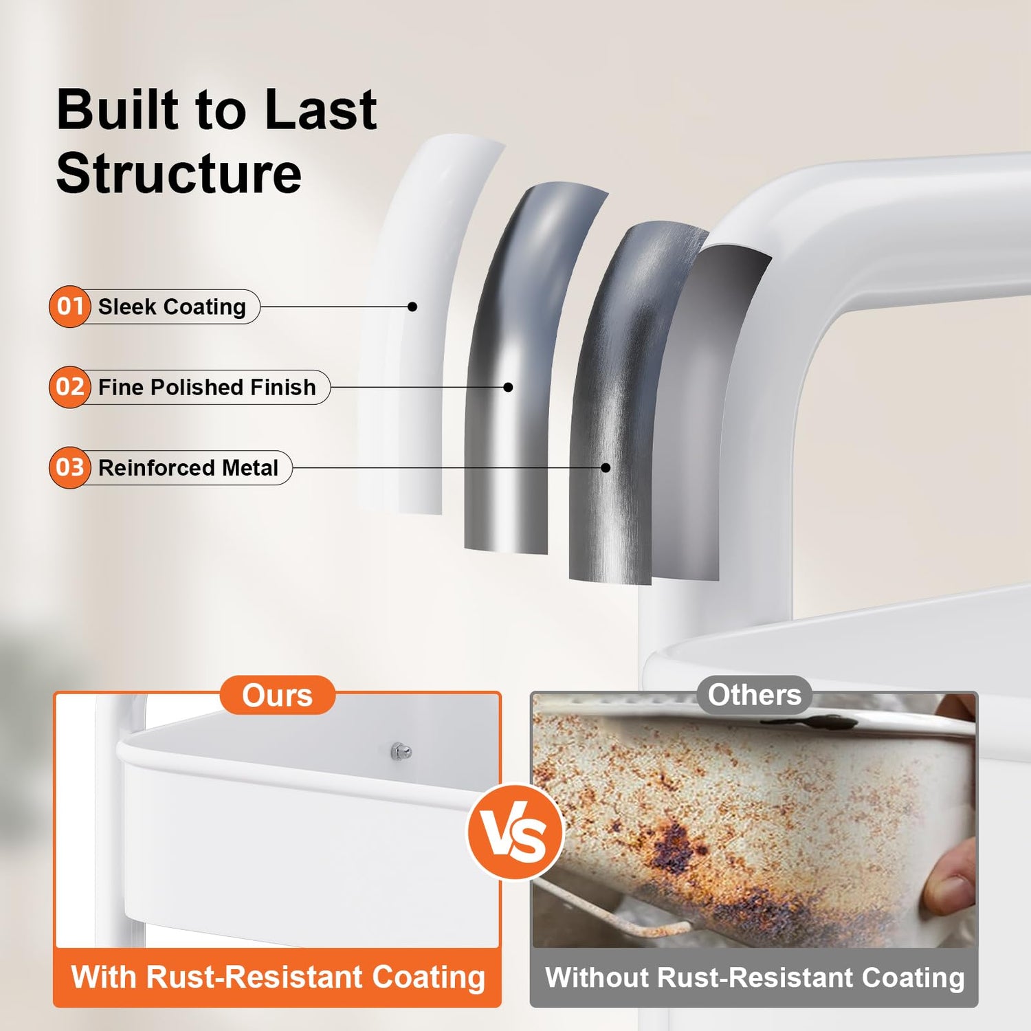 3 Tier Rolling Cart Metal with Wheels, White Three Tiered Craft Cart Organizer on Wheels, Storage Utility Carts for Art, Baby Nursery,Diaper Caddy, Cleaning Supplies, Nail,Lash,Snack,Book,Roller Shelf