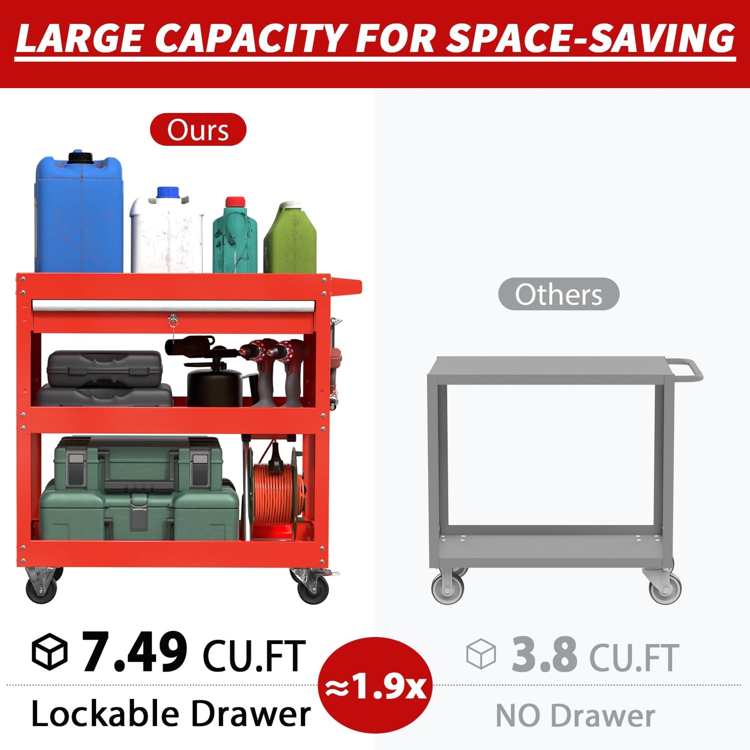 3 Tier Rolling Tool Cart, Tool Cart with Wheels and Drawers, 500 LBS Capacity Service Utility Cart, Mechanic Tool Cart on Wheels for Garage, Warehouse, Repair Shop, Red