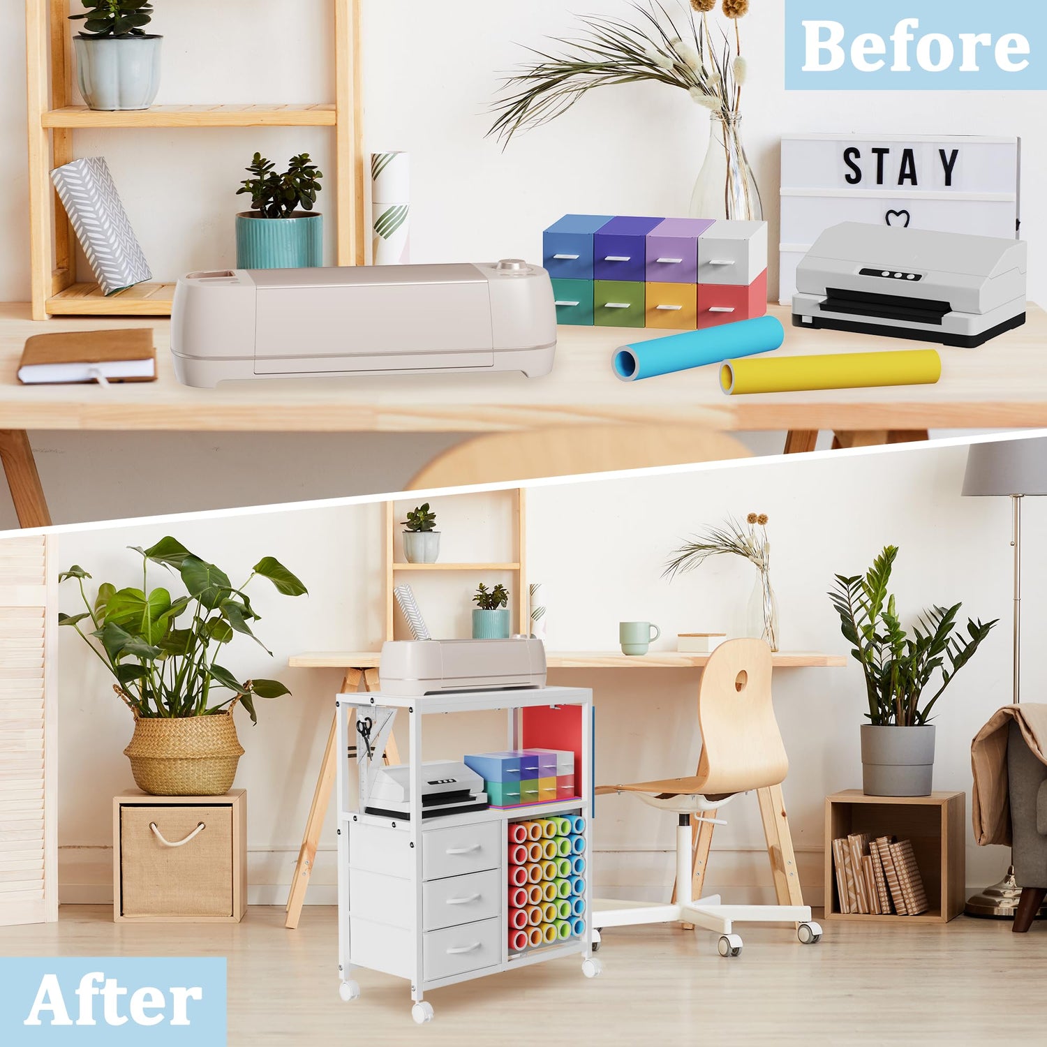 - 【Ultimate Craft Cart】 Our all-in-one Craft cart stores all your DIY craft supplies. The top shelf can hold cutting machines, and the middle shelf can hold heat presses, while the side hooks can hold cutting mats, vinyl weeding tools, and other accessories. The vinyl roll organizer stores up to 30 vinyl rolls. It comes with 3 fabric drawers. All your machines and supplies have dedicated spaces, allowing you to craft seamlessly and efficiently.
