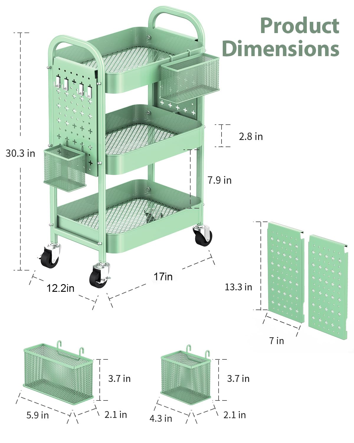 - 【Special DIY Pegboard】This 3 tier rolling cart features 2 metal DIY pegboard that can be positioned on the front or side according to your preference. You can also freely add hooks to the pegboard for storage. Additionally, the rolling cart comes with two hanging baskets and four hooks, significantly enhancing storage space and catering to your DIY needs.