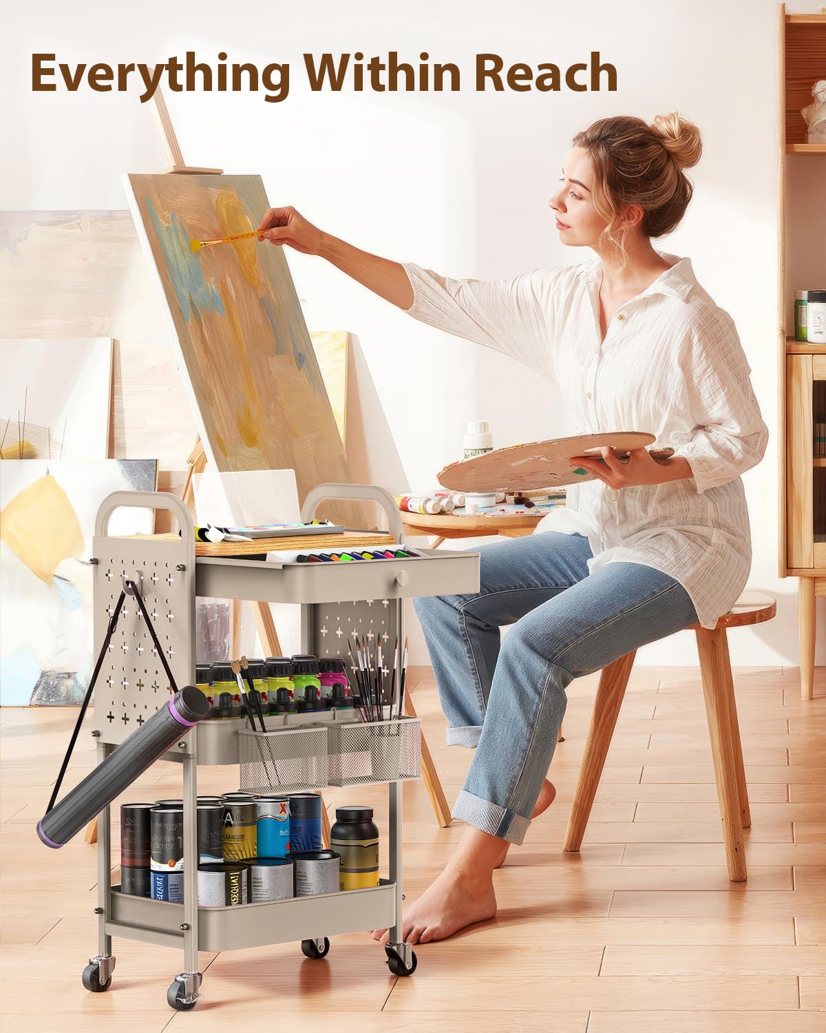 - Drawers & Extra Storage:Two pull-out drawers beneath the top shelf provide hidden storage for smaller items, keeping your space clutter-free. In addition, the craft cart comes with 2 hanging baskets and 10 hooks on the pegboards, offering extra storage for tools, utensils, craft supplies, or accessories. Everything stays neatly organized and within reach in the kitchen, bathroom, office, or craft room.