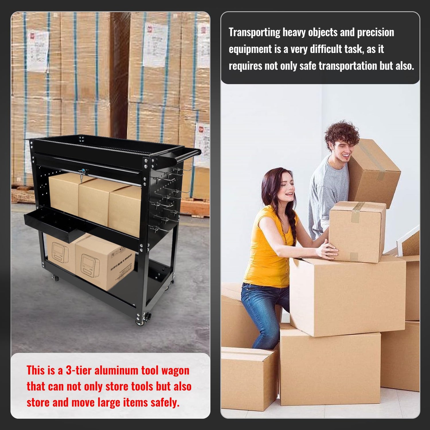 - 【Swivel & Fixed Wheels】 The tool cart has swivel casters (2 wheels) and fixed casters (2 wheels) with brakes so that the tool cart can be easily fixed and used even on slopes or uneven surfaces. 360-degree swivel casters enable omnidirectional movement and movement in different dimensions.