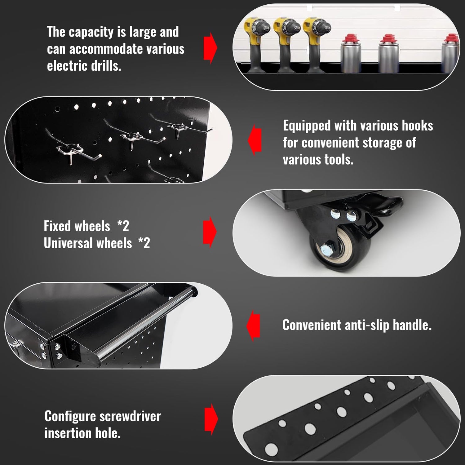 - 【Large Capacity & Side Storage】 You can DIY various hooks in the mesh side panels. It also has a row screwdriver hole for easy access to the screwdriver. It is 3-layered and can hold toolboxes.