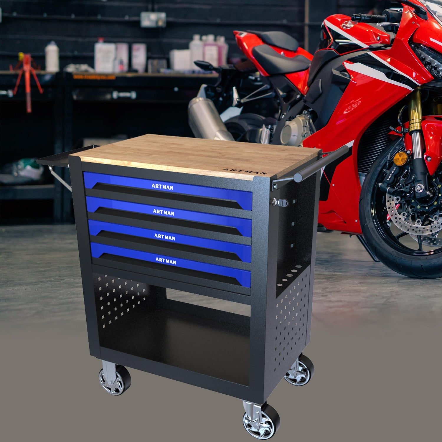 Campfun Tool Chest with Wheels Rolling Tool Box with 4 Drawers, Tool Cart with Wooden Top, Multifunction Rolling Tool Storage Cabinet, Mechanic Tool Chest Workbench for Garage, Repair Shop, Blue