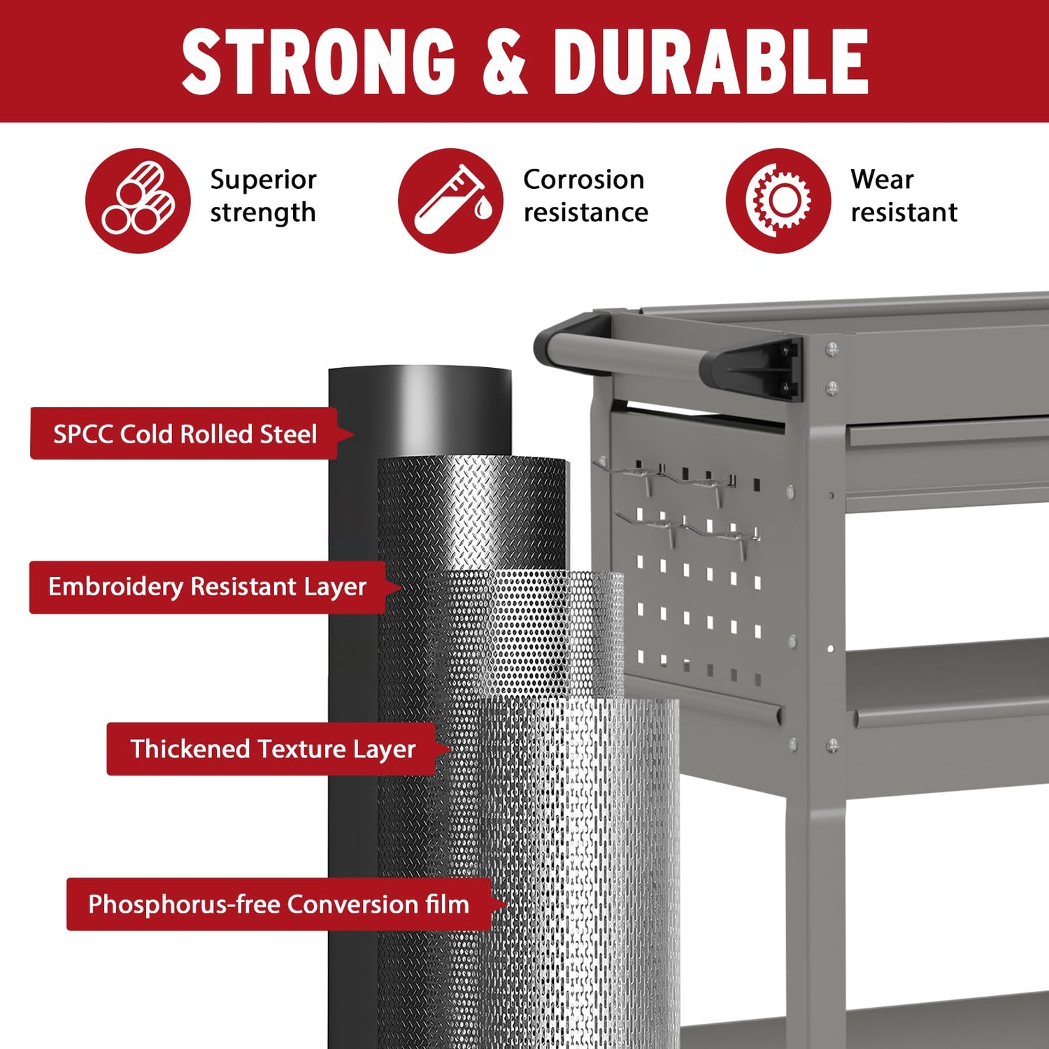 Cemostey 3-Tier Rolling Utility Cart, Heavy Duty Tool Cart on Wheels, Metal Service Cart with Locked Drawers for Garage, Warehouse and Repair Shop (Grey)