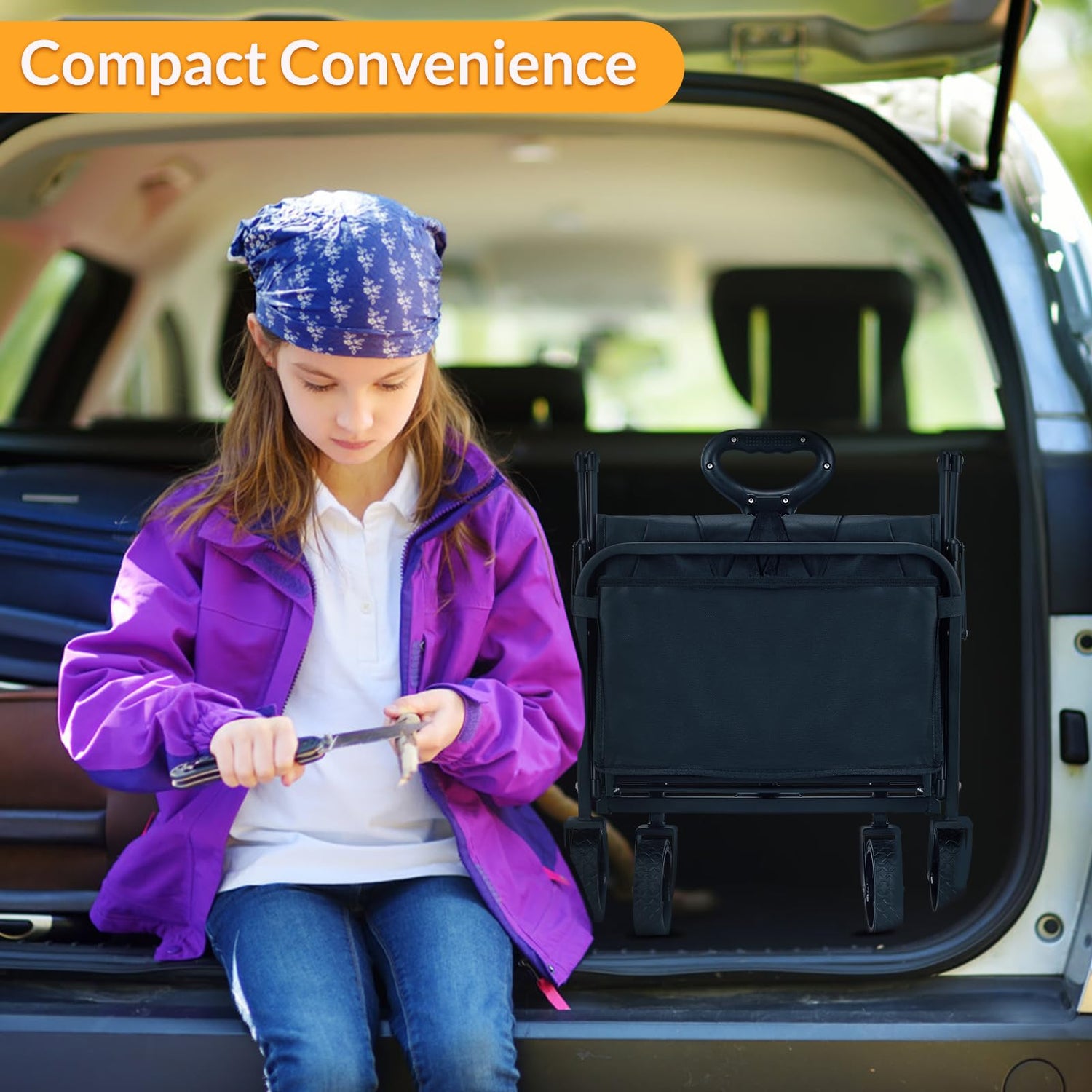 • Fast Set-Up Fold and Unfold - No assembly required, Fast and easy to set up in seconds ,This folding heavy-duty wagon can be folded compactly to store easily in a compact car, or garage, ensuring easy transport.