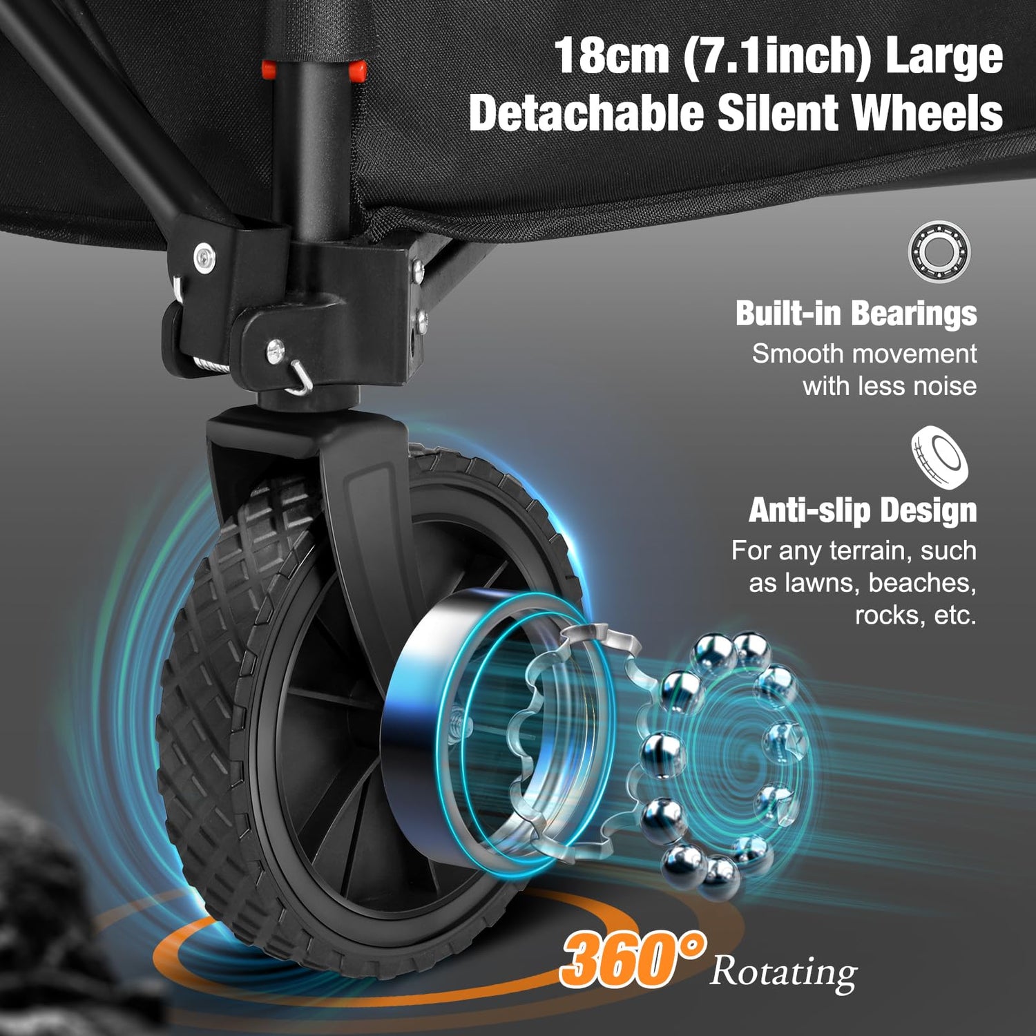 • ALL-TERRAIN WHEELS: Features 7-inch large wheels, the two 360° swivel front wheels help you effortlessly maneuver the direction of foldable wagons carts. The built-in dual-bearing design ensures smoother steering and dragging. The big wheels are more suited for all-terrain surfaces like beaches, grass, rocky areas, and pathways.