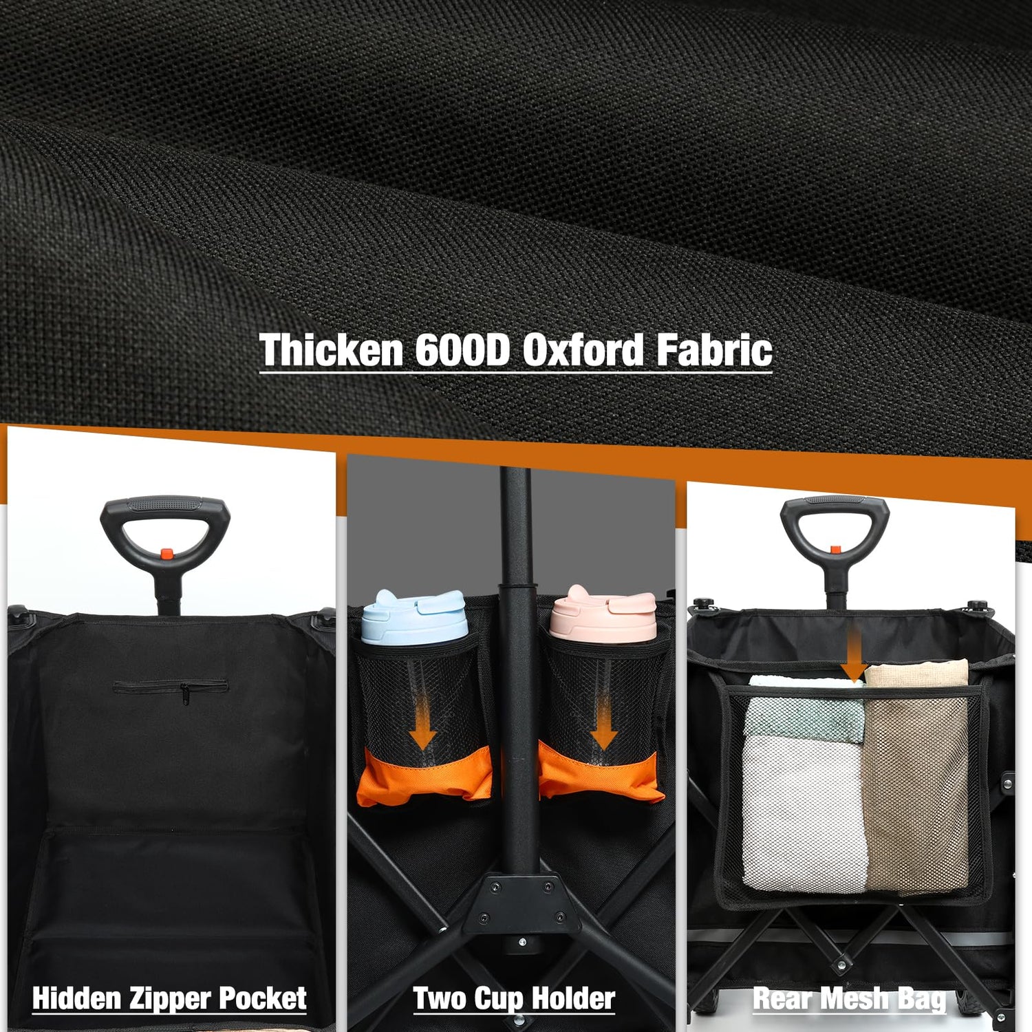 • MULTI POCKETS: Made of double-layer, waterproof, tear-resistant 600D nylon Oxford, and can be quickly removed from foldable wagon when you clean it. Built-in an inside zipper pocket, a rear mesh pocket for valuables or small items, and two cup holders for your water bottles.
