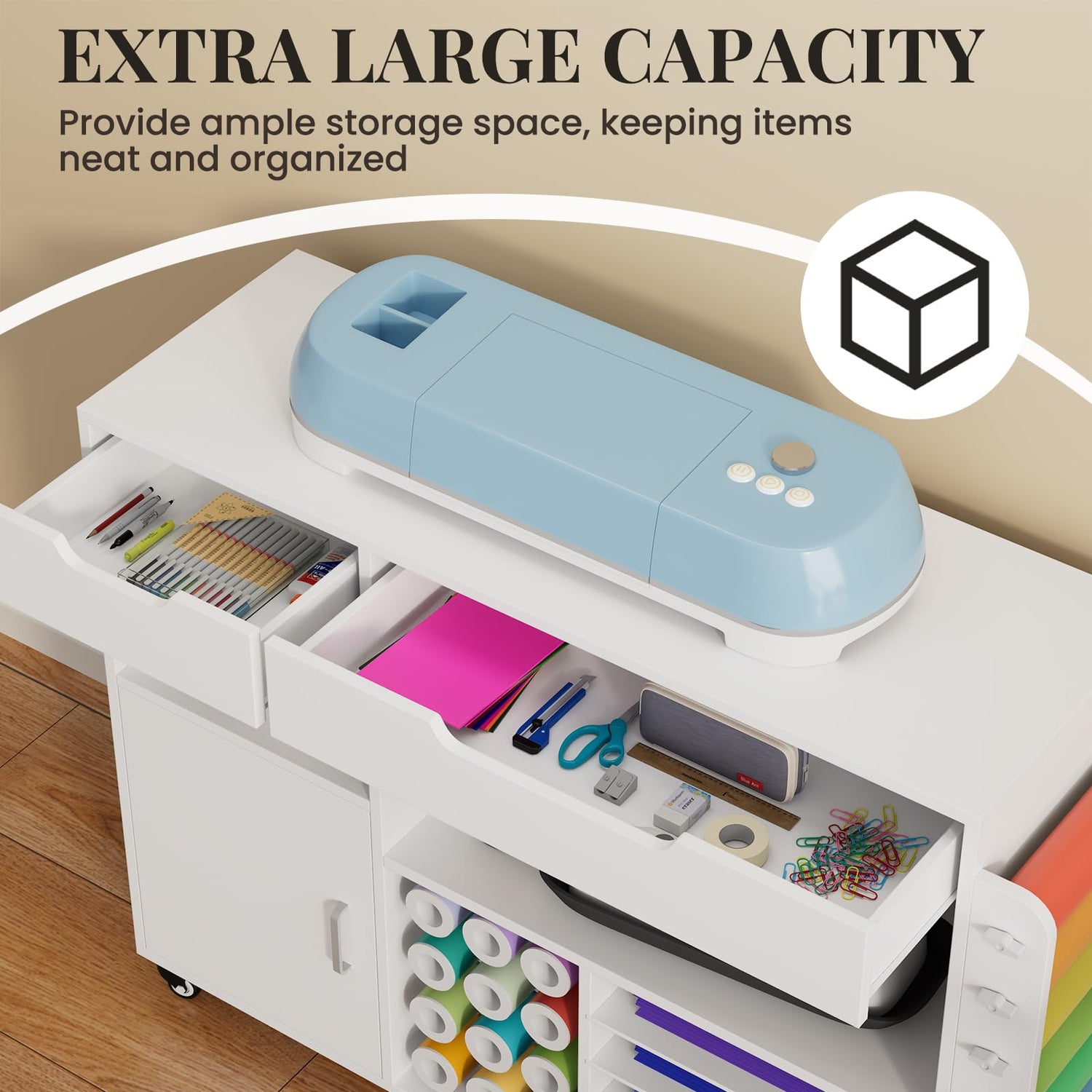 • [Spacious & Practical Craft Cart] Our CXQ craft cart is thoughtfully designed to accommodate multiple cutting machines, vinyl rolls, craft tools, and accessories. Featuring two spacious drawers and a cabinet door, it provides ample storage to keep your workspace organized. Whether you're a hobbyist or a professional crafter, this cart ensures all your materials are within easy reach, promoting efficiency and creativity.