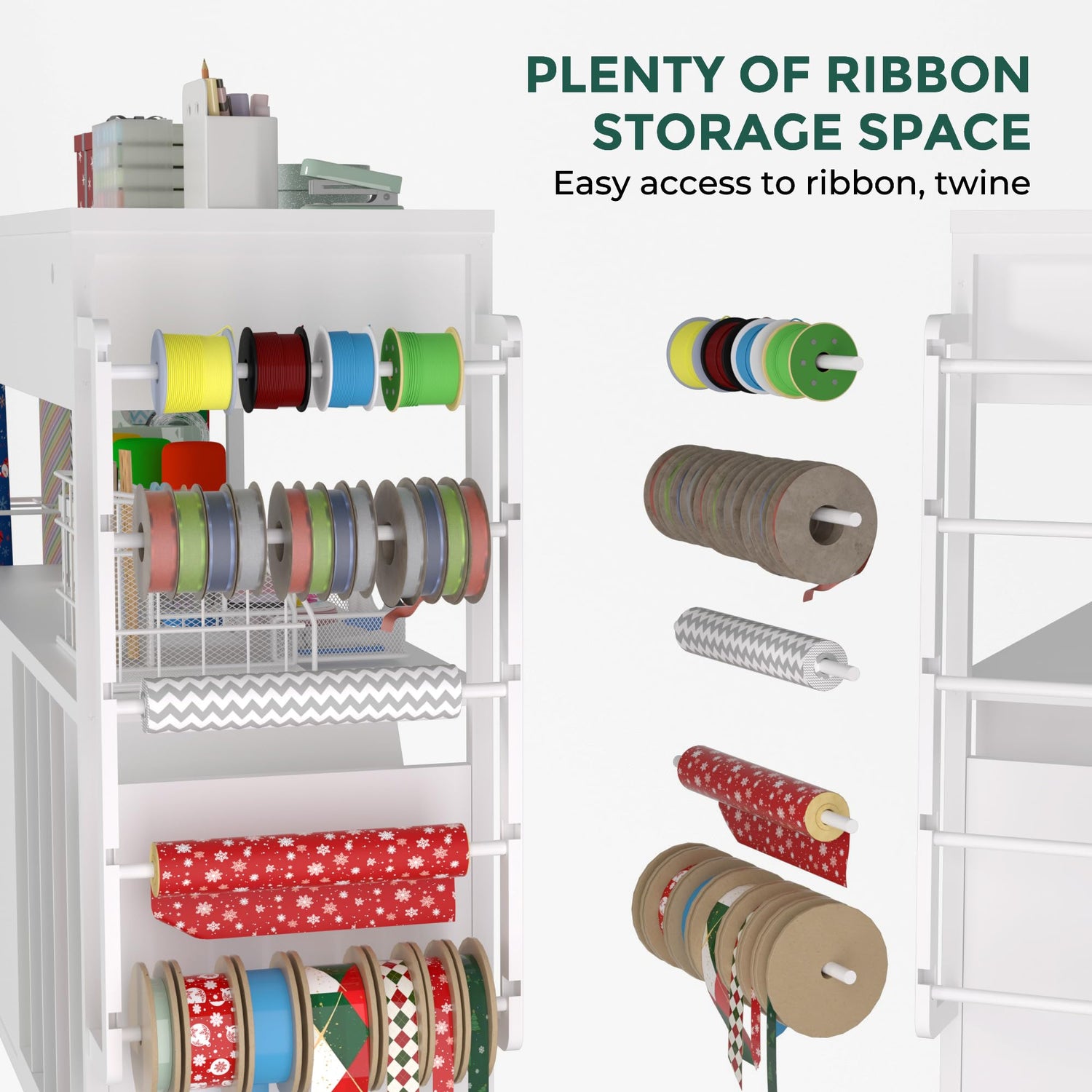 - Massive Storage Capacity for All Supplies – Organize with ease: the vertical wrapping paper rack holds 3–12 rolls, the left-side ribbon roller dispenses hemp ropes/ribbons, and the bottom left compartment stores gift bags of all sizes. The middle shelf and wooden drawers offer flexible space for cardboard, spare machines, and accessories, keeping everything within arm’s reach.