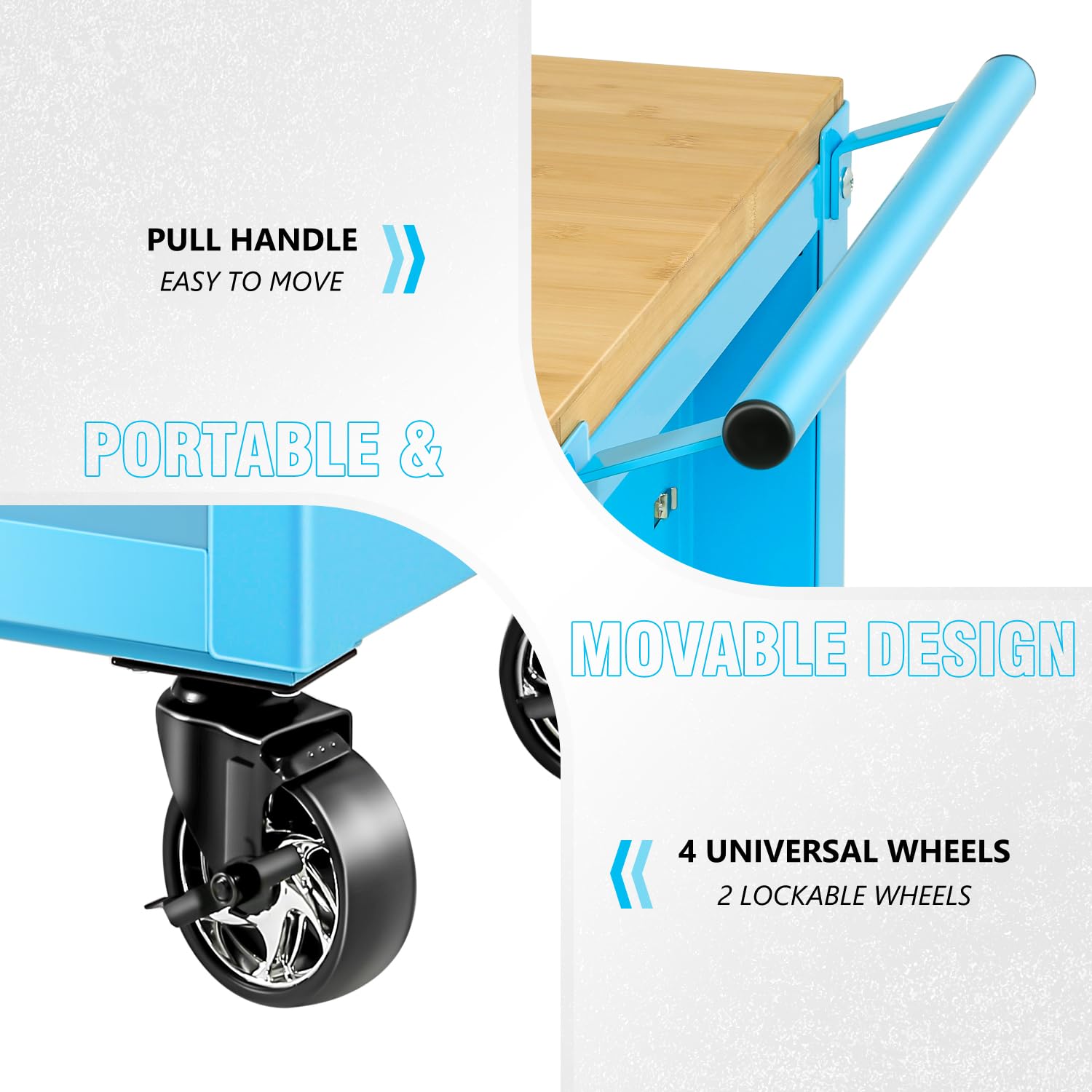 - 4-DRAWERS TOOL CABINET - This bamboo top rolling tool box with 4 drawers, large bottom storage space and side foldable tray , provides abundant space for your tools and accessories.