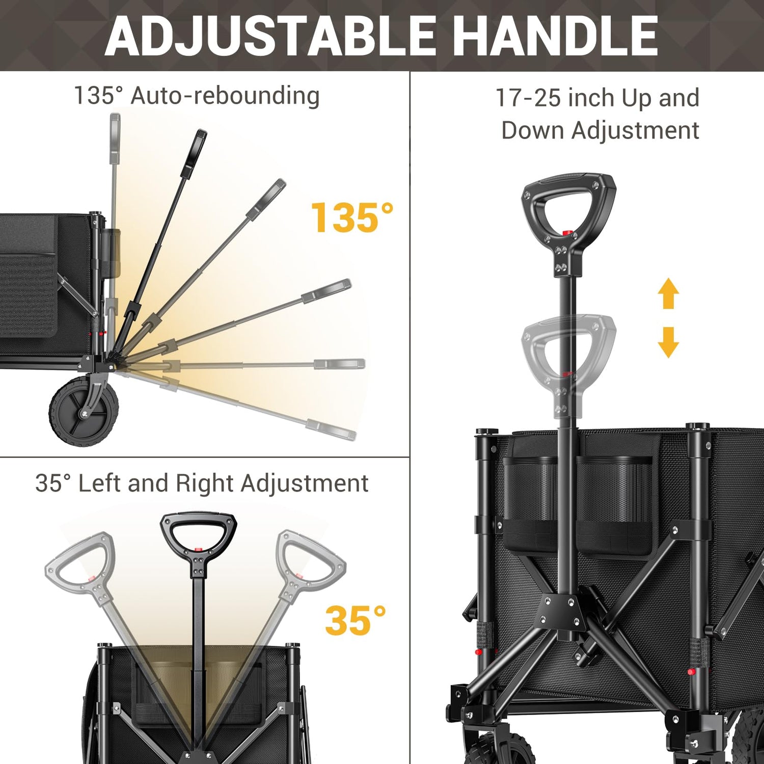 - Handle Master - Flexible Functionality: The handle of our folding wagon boasts a flexible range of 135°, accommodating various user requirements. Height adjustment is also possible with its vibrant up and down movement, further enhancing convenience. A rebound function allows the handle to stay upright upon release, eliminating the need to bend over, facilitating effortless access. The comfortable grip, pursued in its design, makes each use a pleasant experience.
