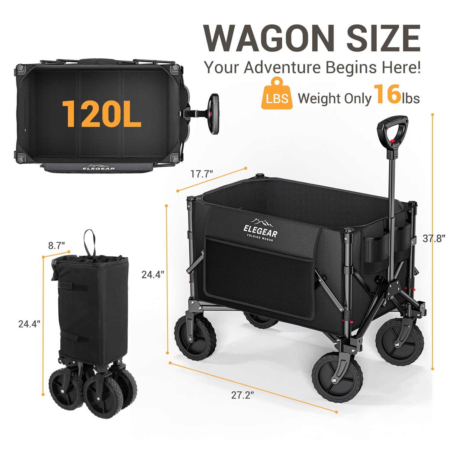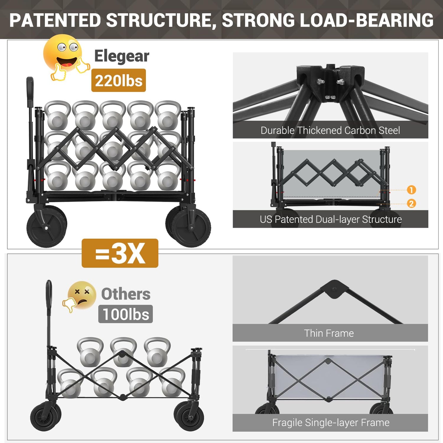 - Capacity Commander - Beyond Expectations: At Elegear, we prioritize both capacity and stability in our folding wagon design. Featuring a US patented dual-layer bottom chassis framework and crafted from high-quality thickened carbon steel, this grocery wagon achieves a voluminous 120L capacity while supporting a robust 220lbs weight, ensuring unparalleled stability. You will embark on your adventures fully equipped and assured!