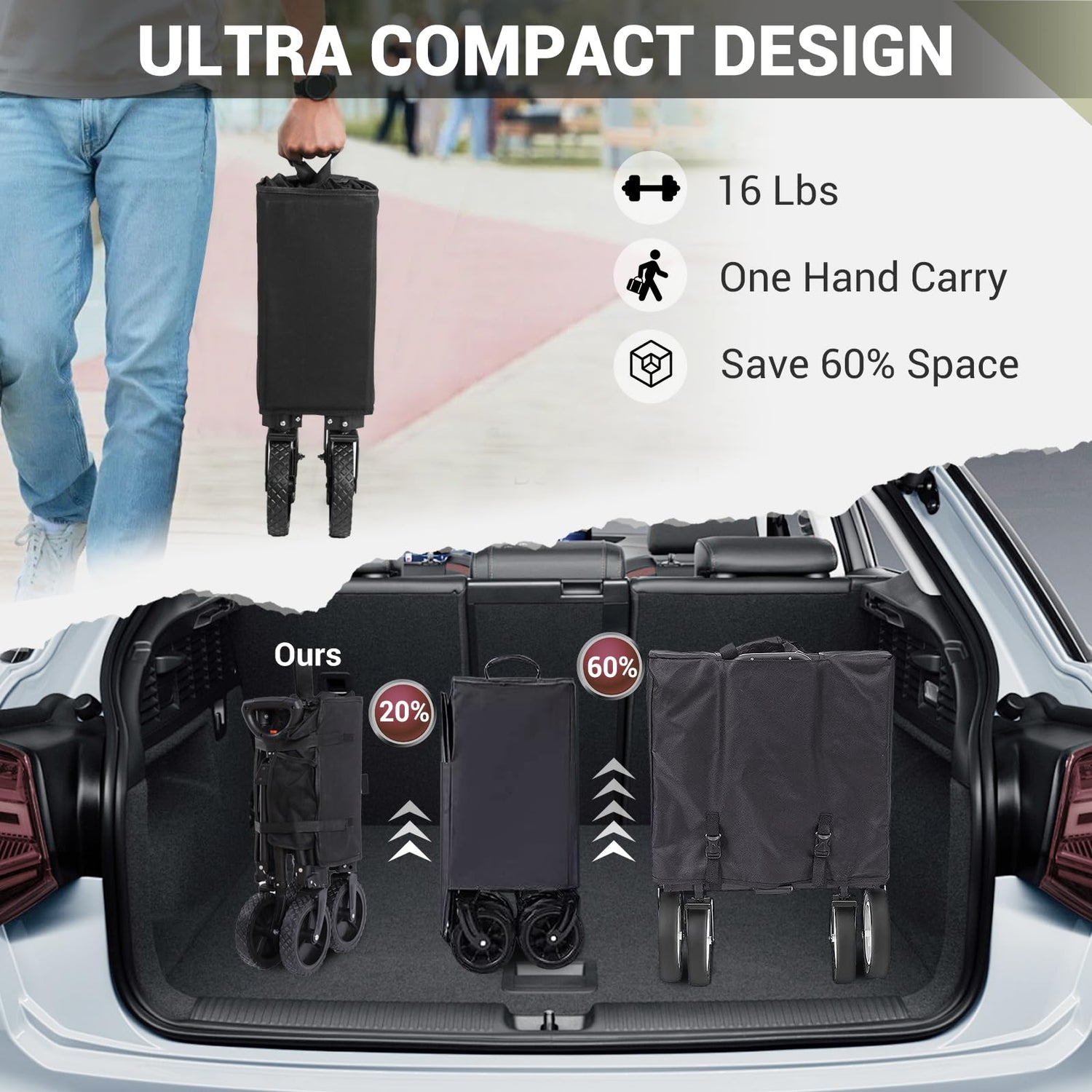 - SpaceSaver Wagon - The Ultimate Space Solution: Ready for effortless transportation? Our collapsible wagon redefines convenience! With its innovative design, easily detach the wheels, fold the wagon cart, and store it compactly, weighing just 16lbs and conveniently portable with one hand. Boasting the smallest folding volume on the market, it saves 60% more space than conventional foldable wagons. Say goodbye to bulky gear and hello to hassle-free adventures with our must-have outdoor wagon.