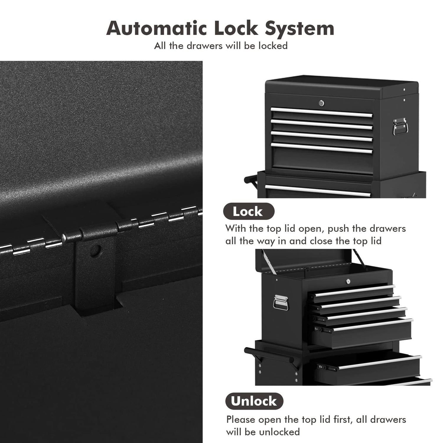- Ample Storage Space - With top tray, 6 drawers (4 drawers are lockable ) and bottom cabinet, the offers ample storage space to keep a variety of tools and and accessories. Besides, the 4 removable hooks is suitable for hanging wrenches.