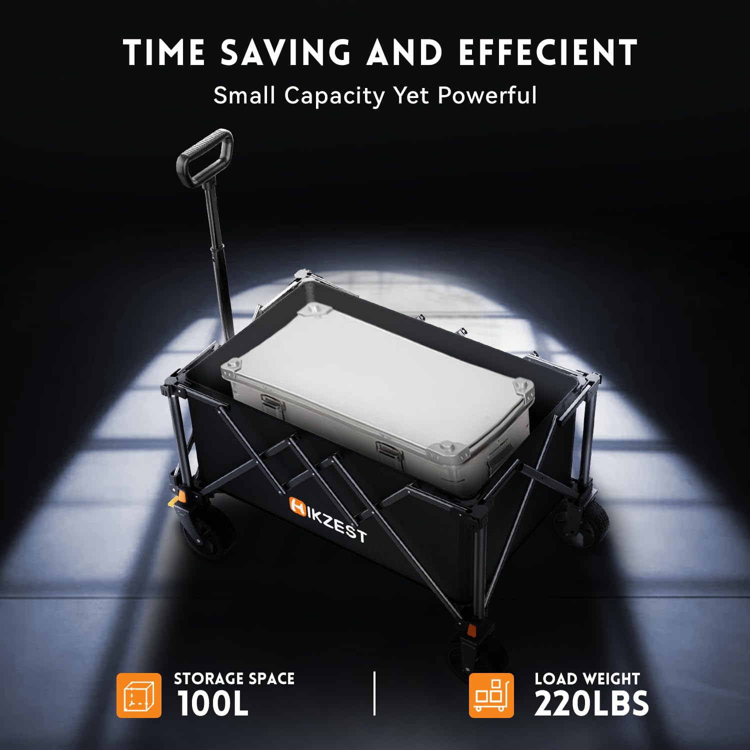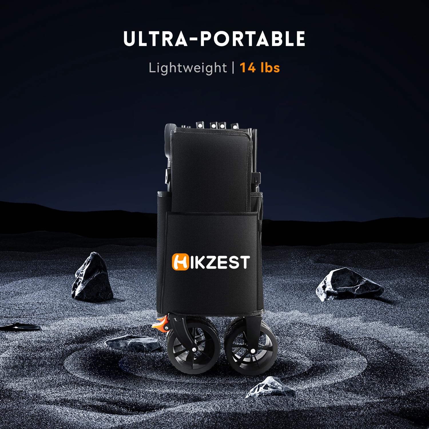 • ▶Super Compact & Effortlessly Portable: The Hikzest collapsible wagon cart is a marvel of ingenuity, with its innovative four-way fold, it transforms into a sleek, compact package that slides seamlessly into even the tightest of spaces. And weighing in at a feather-light 14 pounds, it's a cinch to tote around or tuck away in your trunk – no heavy lifting required! Say hello to hassle-free transportation that takes up barely a quarter of your car trunk or closet space, freeing you from the burdens of backaches and muscle strain.