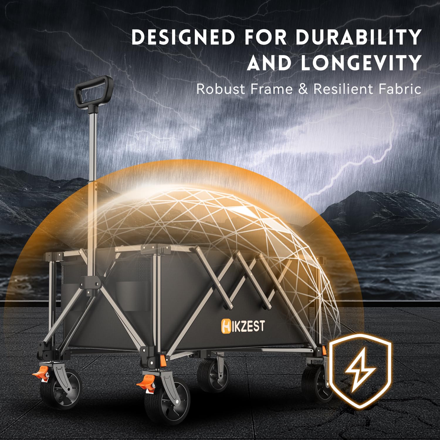 • ▶Ruggedly Reliable & Stylishly Durable: Embark on your next adventure with Hikzest heavy duty foldable wagon that's a symbol of resilience. Crafted with a sturdy frame and cutting-edge tech, it handles loads up to 220 pounds effortlessly. The premium 600d oxford interior guards your gear like a loyal companion, ensuring safety and security. Pack your essentials and extras with confidence, and stride ahead in style, backed by unbreakable durability.
