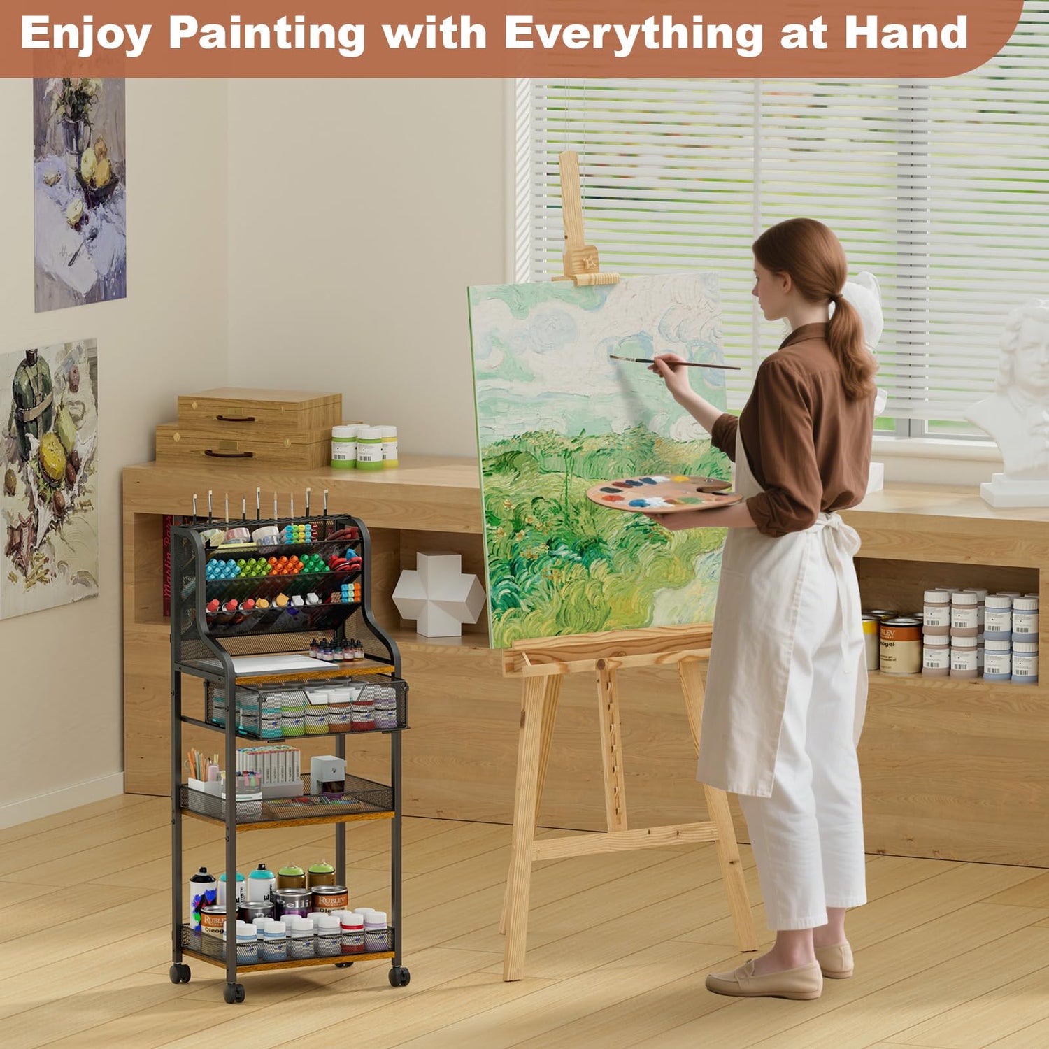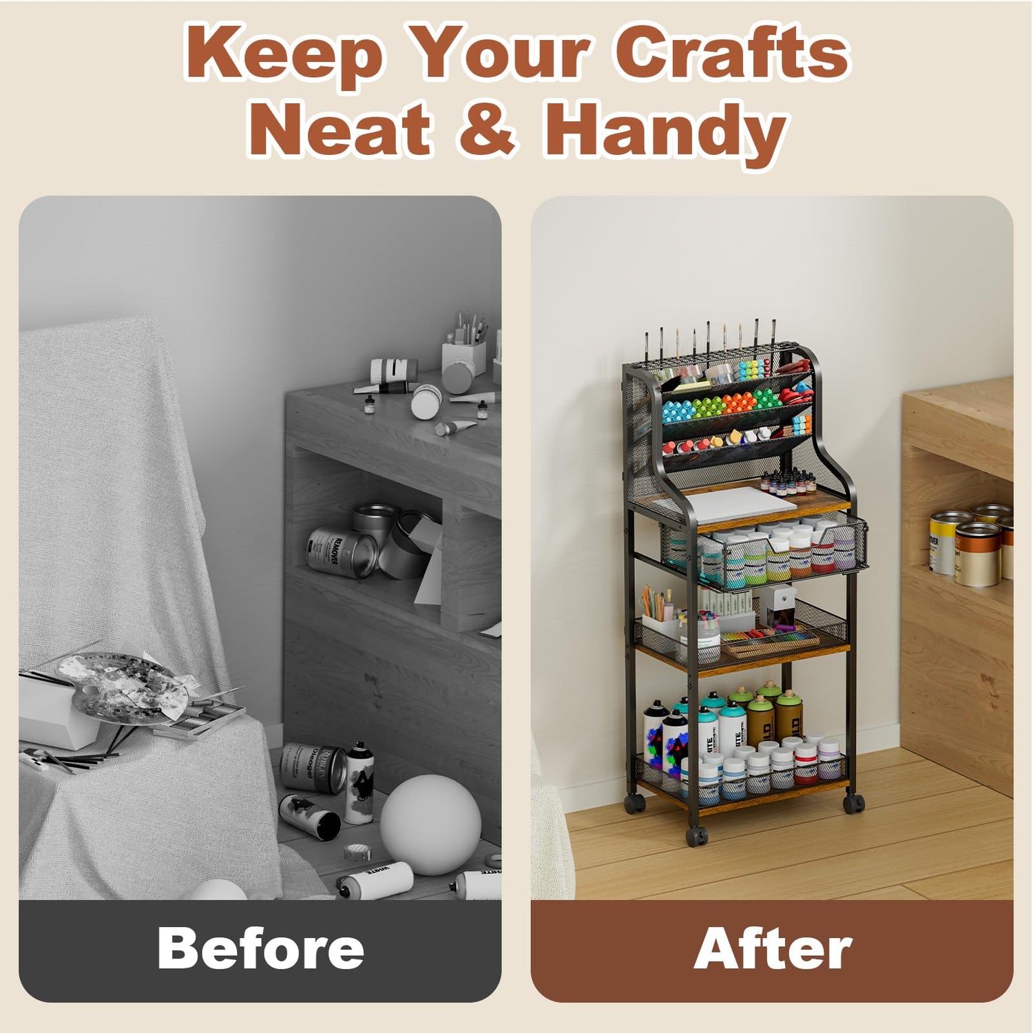 • 【Durable Metal & Wood with Bottom Rim】Constructed from sturdy metal and wood, this cart provides excellent load-bearing capacity and stability. The bottom two tiers feature raised edges to prevent paints, brushes, and other supplies from falling while moving. Perfect for craft rooms, art studios, or home offices.