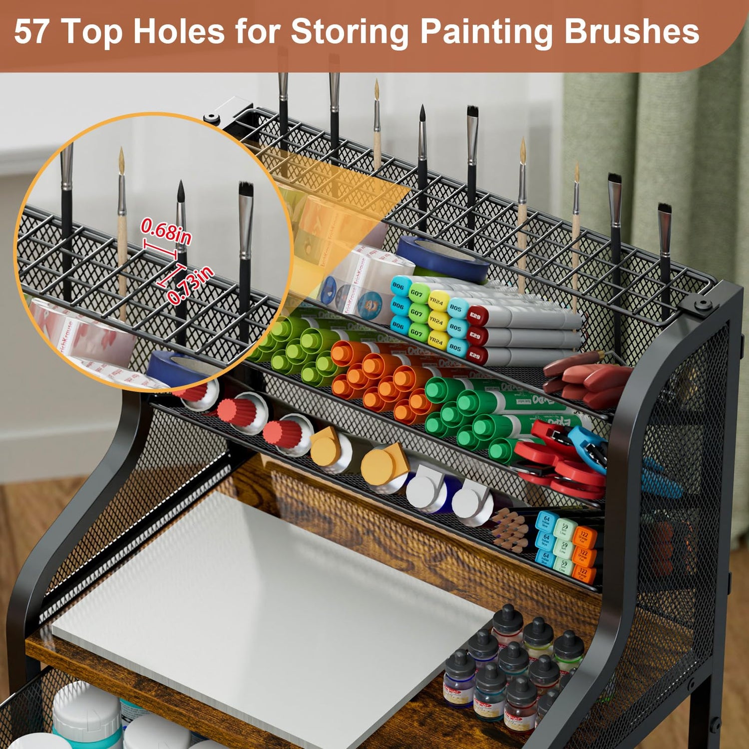 • 【57 Top Holes for Brushes & Tools】The top of the organizer includes 57 small holes (0.68 × 0.73 inches each) to hold paint brushes, pens, and other tools upright. Quickly access your supplies while keeping your studio, craft room, or workspace neat and tidy.