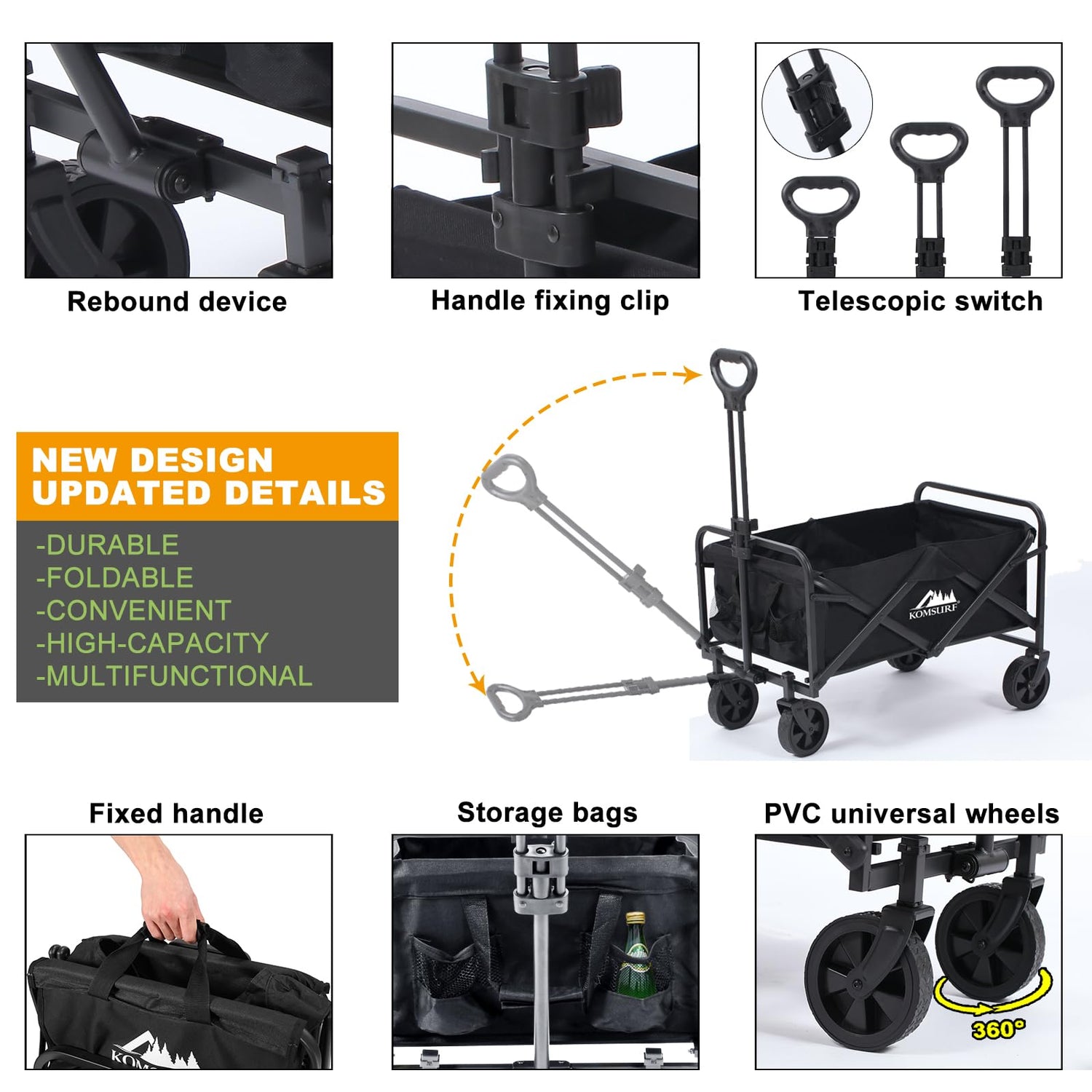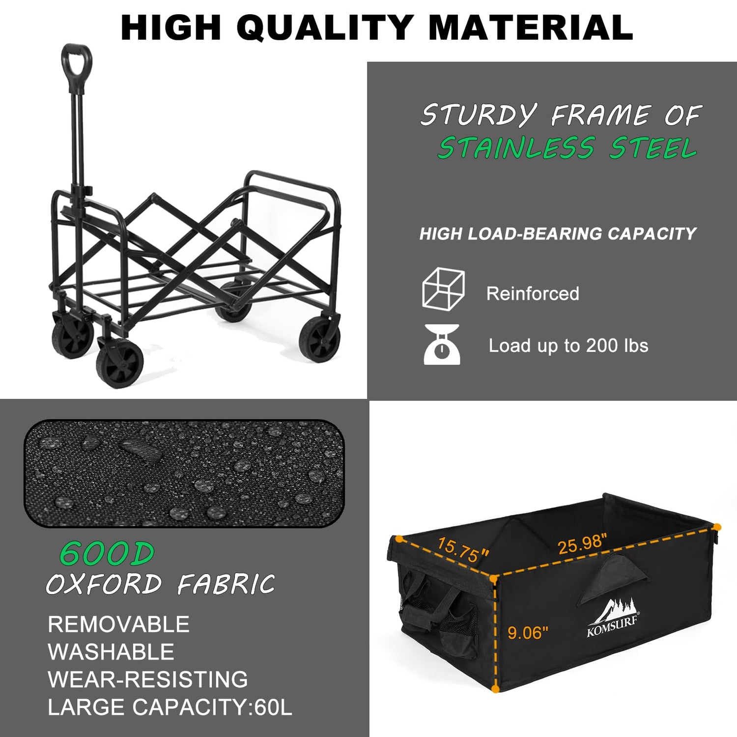 KOMSURF Foldable Utility Wagons Heavy Duty Folding Grocery Cart on Wheels, 200 lbs Capacity with Side Pockets for Garden, Shopping, Sporting and Beach Outdoor Use