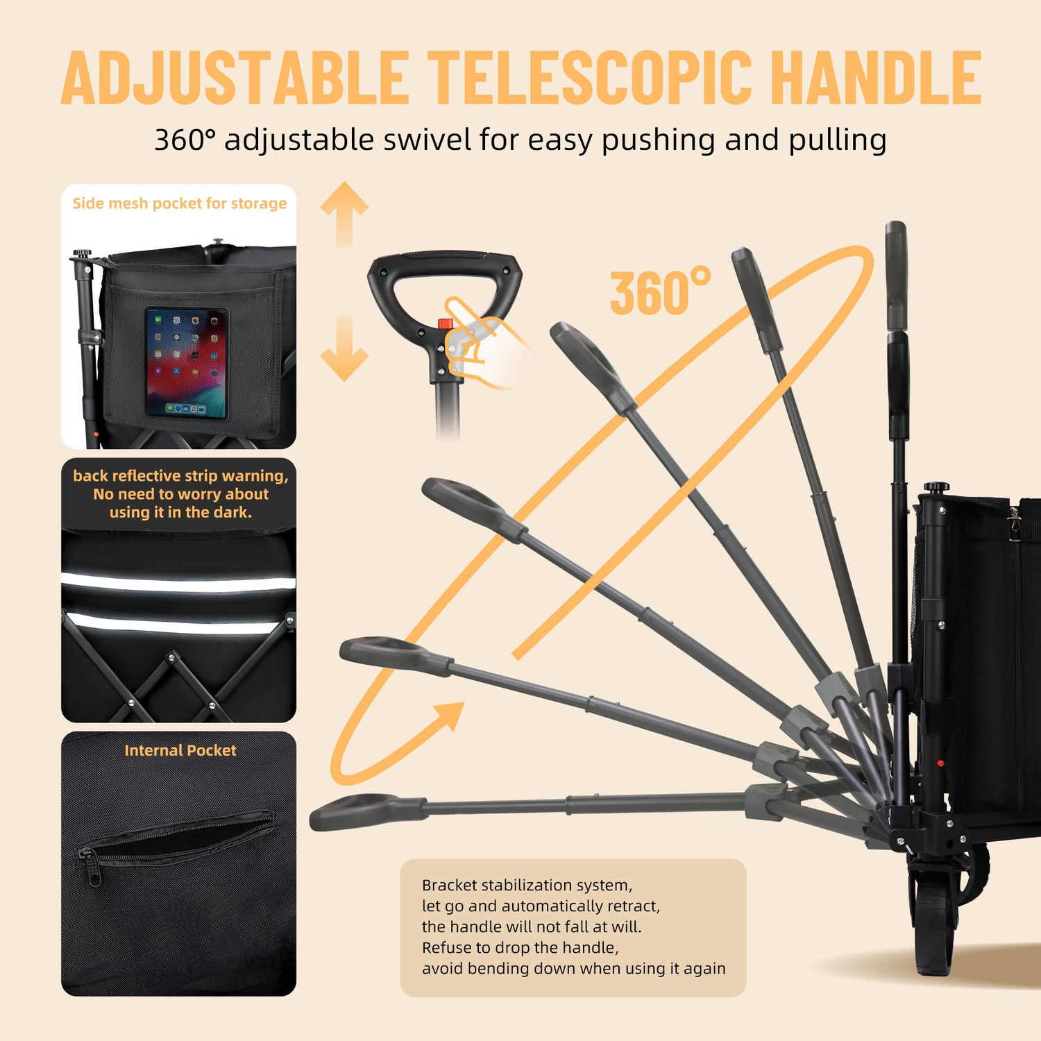 • 【Innovative Side Expansion】Unveiling a fresh design, both sides can be expanded to accommodate longer cargo. With one side open, the travel cart transforms into a small seat, enhancing the camping experience instantly.