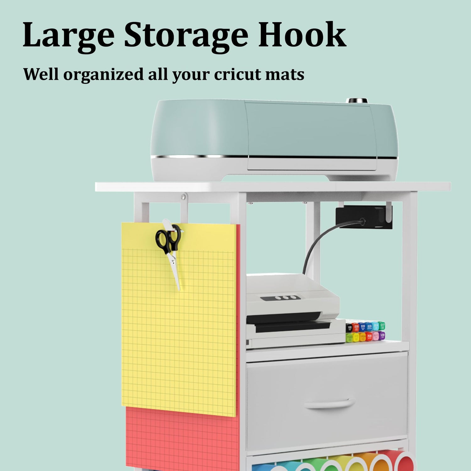 - 【Ultimate Craft Cart】Our all-in-one Craft cart could store all your DIY craft stuff. The top and middle shelves can hold cricut maker machines and heat presses respectively, while the side hook can hold cutting mats. Moreover, the vinyl roll organizer stores up to 24 vinyl rolls.The fabric drawer can storage all your cricut accessories. Drawer size is 10"D x 15.4"W x 5.9"H. All your machines and supplies can find a dedicated space, allowing you to craft seamlessly and efficiently