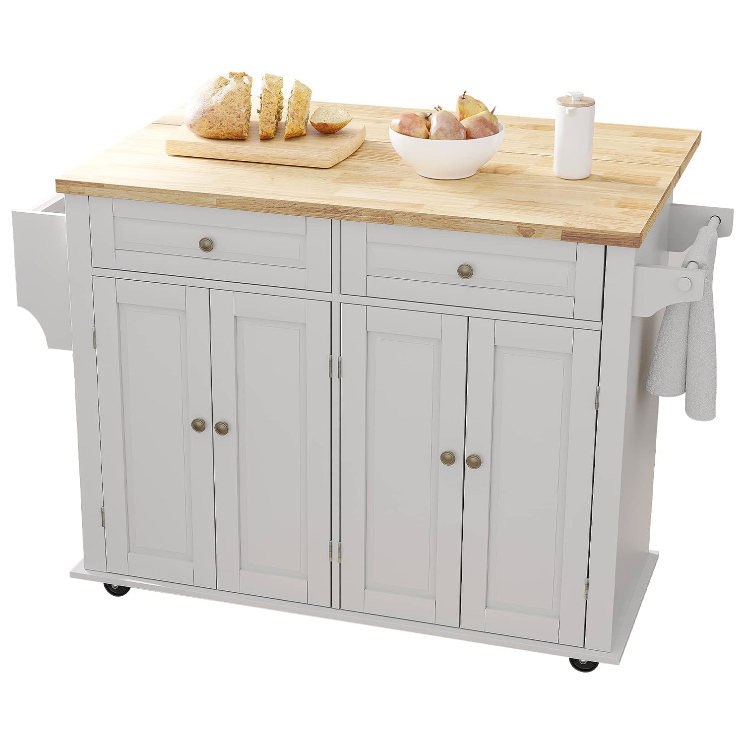 Rolling Kitchen Island with Drop Leaf – Movable Kitchen Carts on Wheels Island with Storage Cabinet, Island Table for Kitchen with Rubber Wood Top and Rack and Drawers, Matte, White