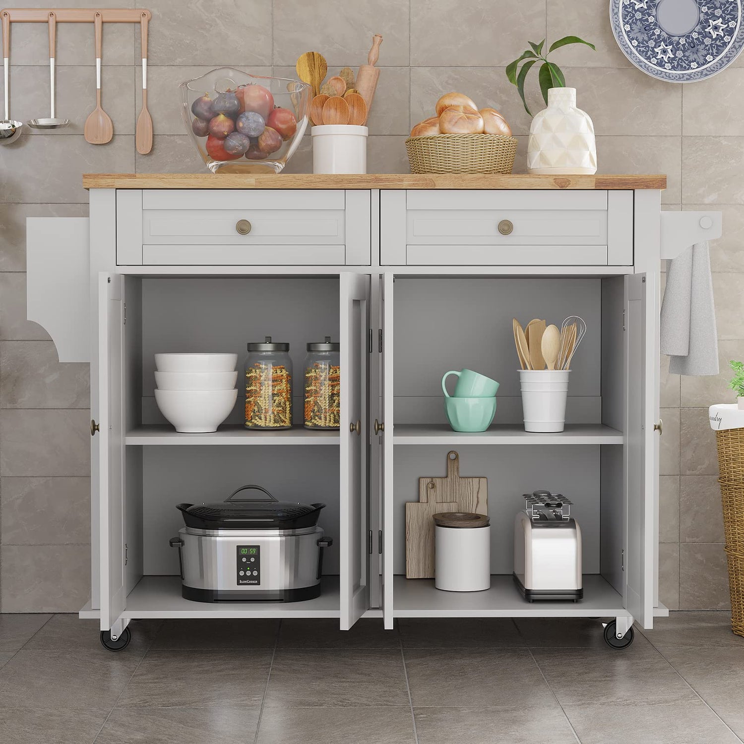 - SPACIOUS BAR CART : The movable kitchen cart gives you extra storage, utility and workspace in kitchen. This engineered wood kitchen cart island includes a rubber wood top, 2 drawers, 2 storage cabinets (with 3-level adjustable shelves), spice rack, towel rack and 5 casters