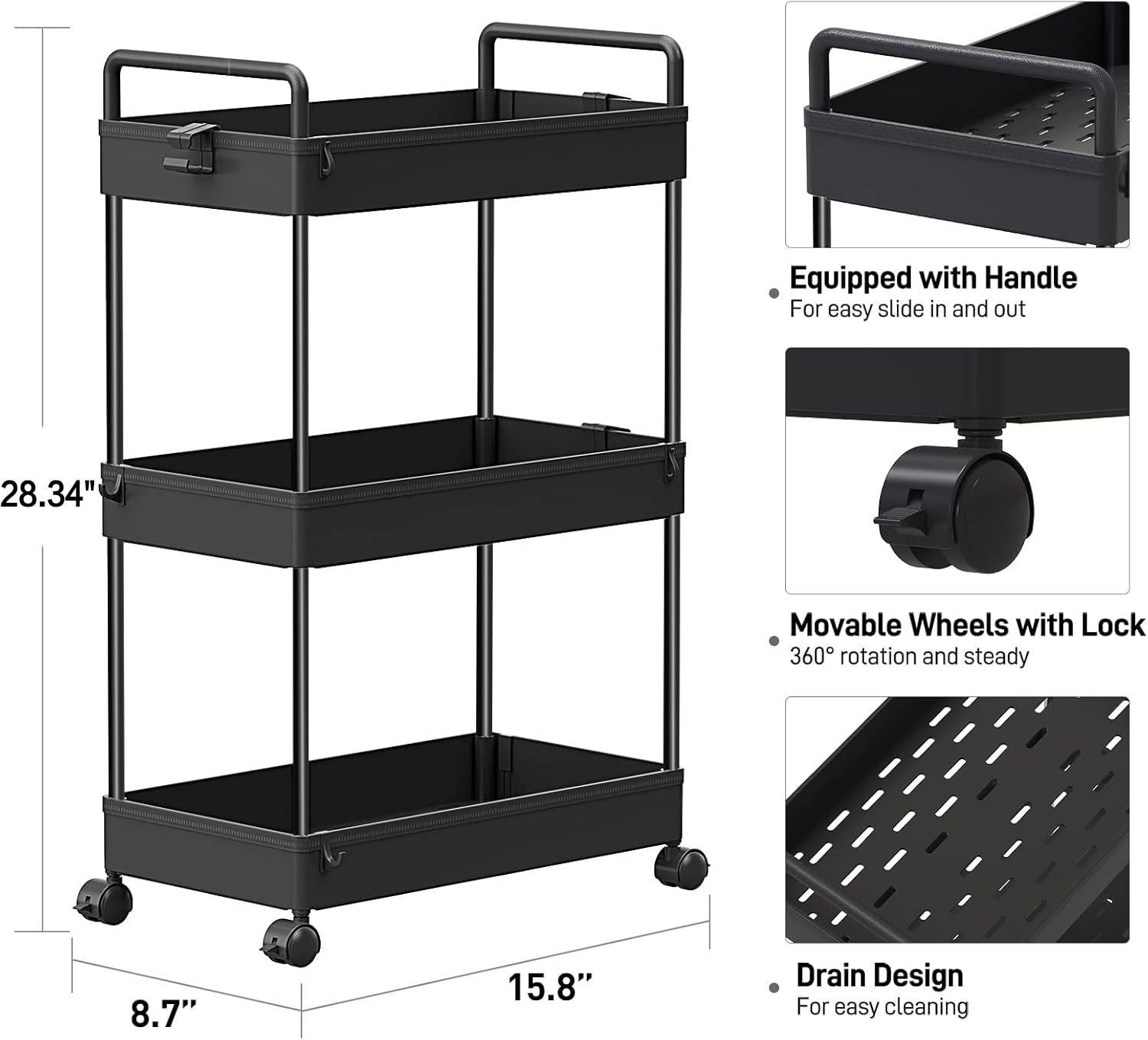 - Flexible 3 Tier Storage Cart : The 3-tier slim storage cart is 8.66 in design which can be used in tight spaces in your home for storage. The shelf unit easily slides between closets, kitchens, bathrooms, garages, laundry rooms, offices or in-between your washer and dryer.