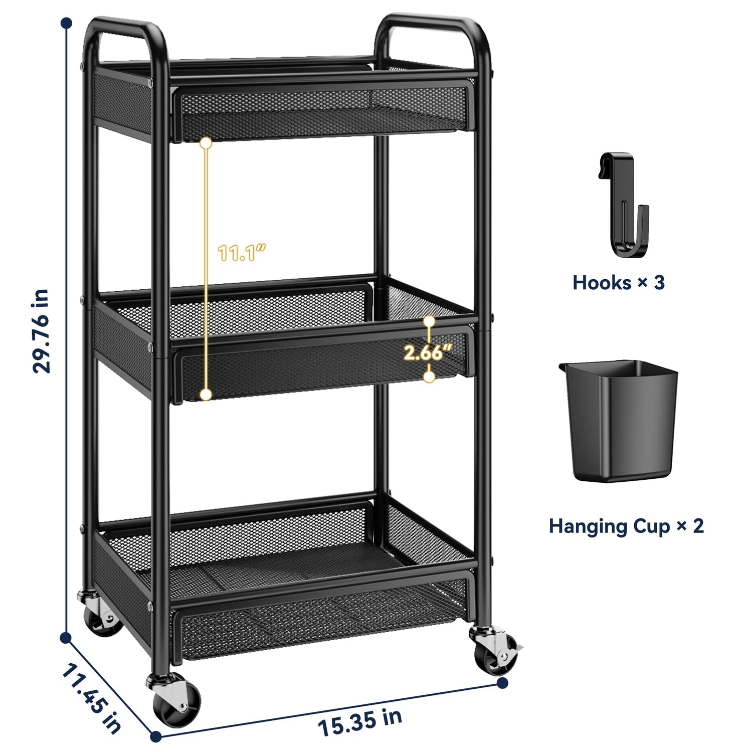 YASONIC 3 Tier Rolling Cart – Metal Utility Storage Cart with Wheels, Craft Cart Organizer with Hanging Cups, Hooks, Mesh Basket for Bedside Kitchen Office Art, Black