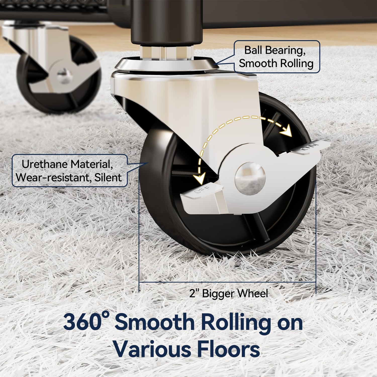 • Effortless Movement Under Heavy Loads: With 2in heavy-duty wheels paired with sturdy frame, the metal rolling cart glides smoothly and stays stable on carpet or hardwood. The wear-resistant urethane wheel won't scratch surfaces