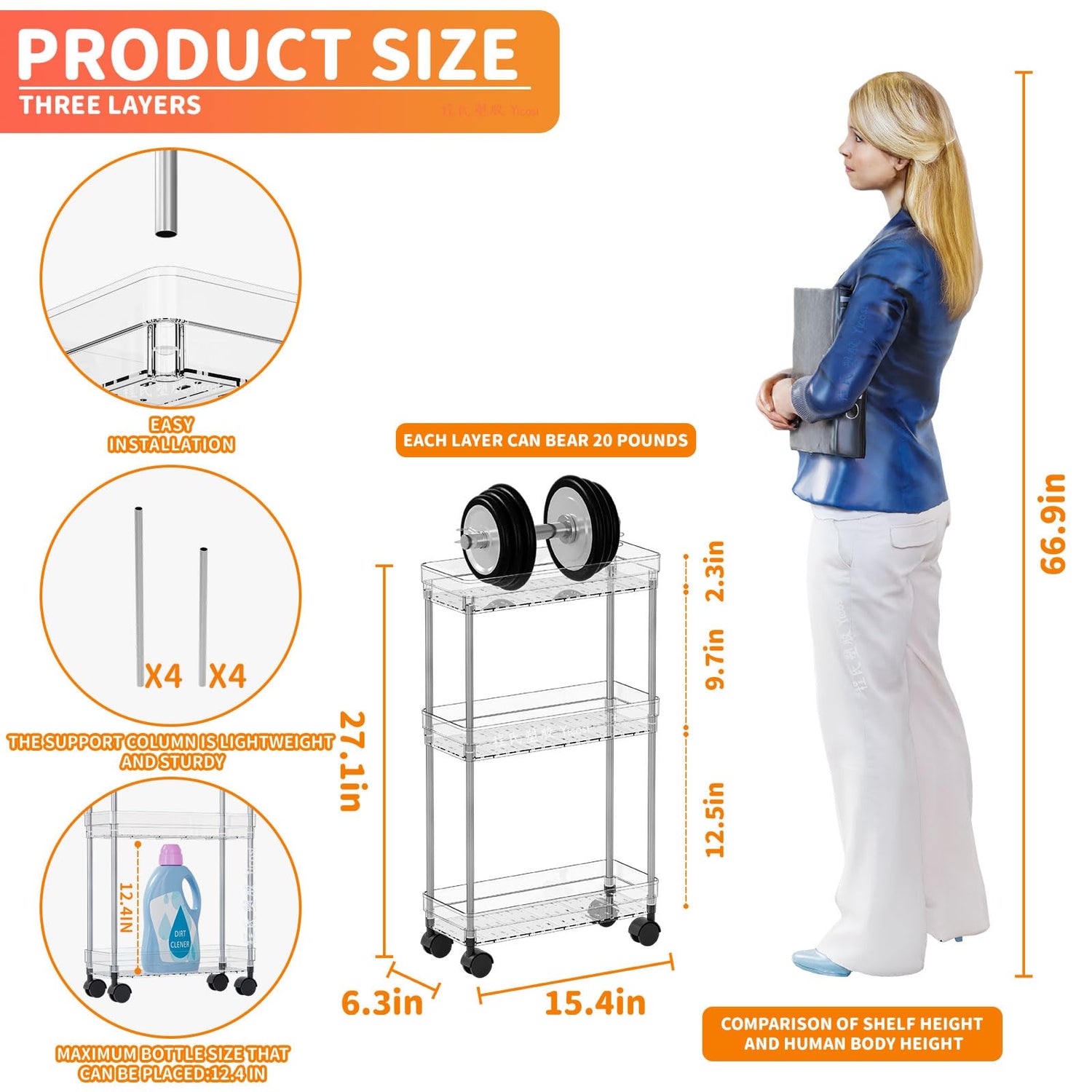- 【Perfect Size / Easy Installation】The overall size of the bathroom storage cart is 6.3 "X 15.4" X 27.1 ", and each floor can store 9.7"tall items (note: The bottom floor height is 12.5", which can place higher items),Simply insert the metal pillar without the need for tools (please refer to the video for more information)