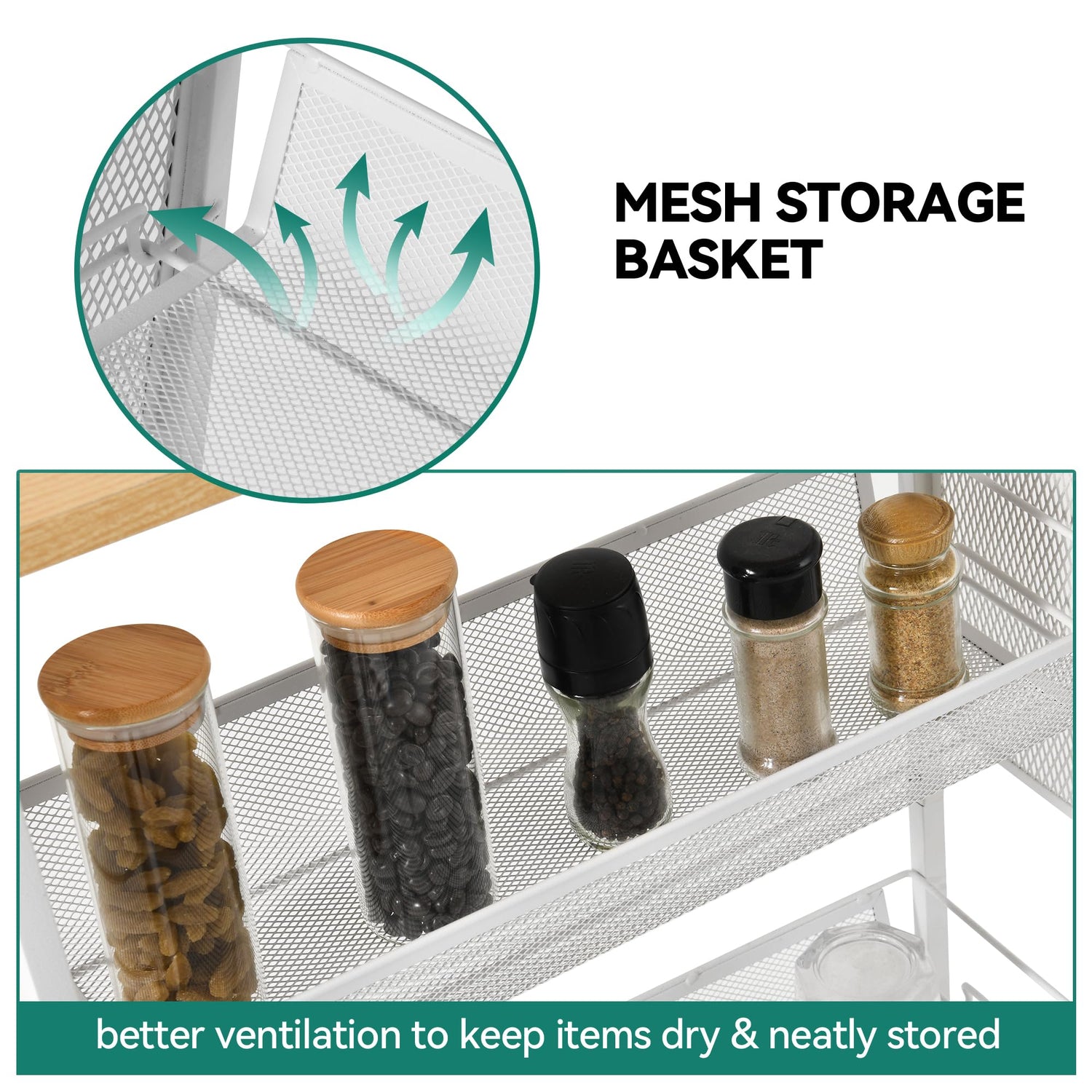 - Mesh rack design: For better ventilation, 3 mesh racks & wood top provide sorted space to hold kitchen spicy pots, drinks, or store shampoo, shower gel, facial cleanser in the bathroom, keeping them dry & clean; added raised bars prevent items from falling.
