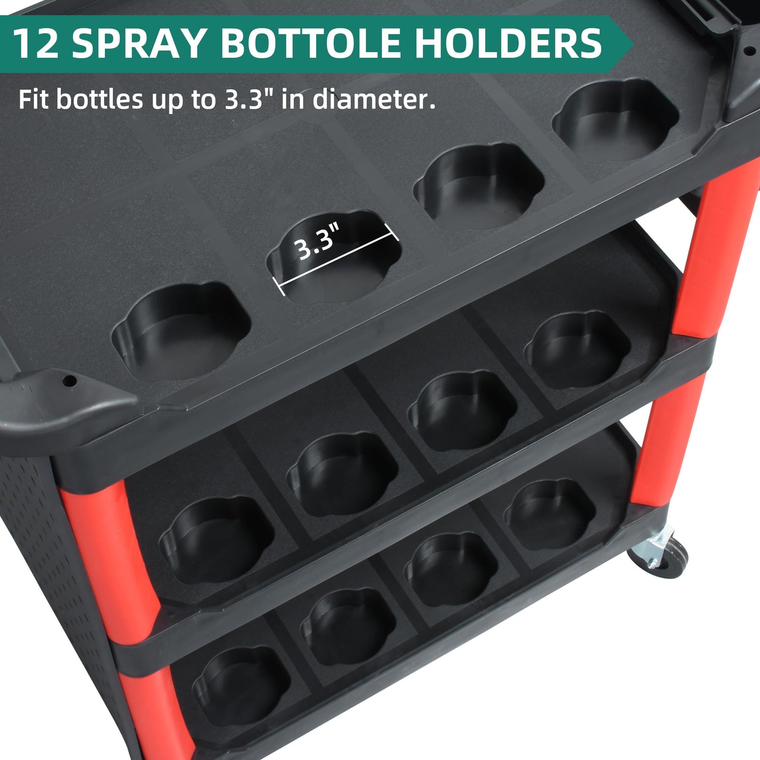 - HUMANIZED DESIGN: Our auto detail cart is equipped with 1 long pegboard with hooks and 1 hanging bucket to easily hang tools; with ergonomic comfort handles on both sides for convenient, easy pushing of the cart; has 12 spray bottle holders; comes with two lockable universal wheels that can be easily opened or closed with just a single step on the wheel locks.