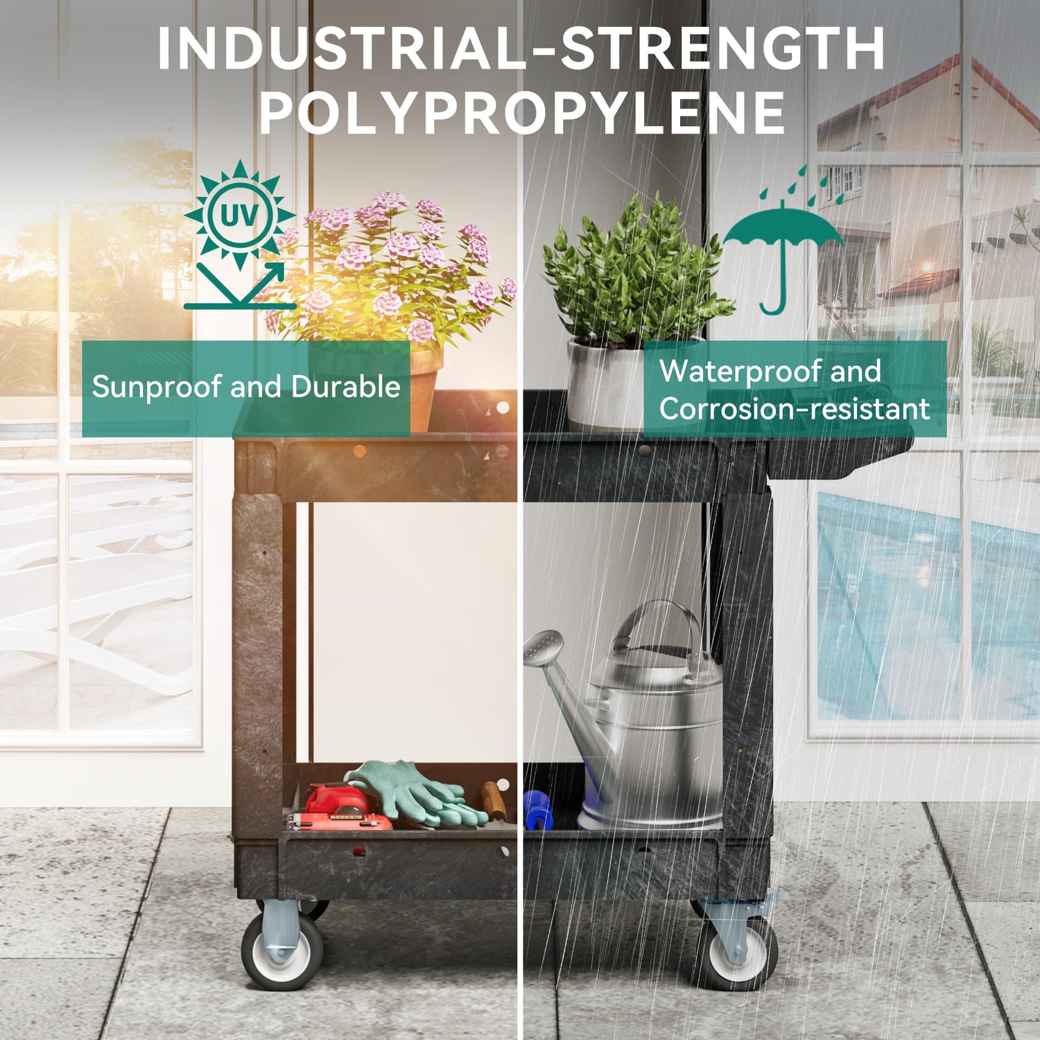 - RAIN & SUN PROTECTION: The plastic utility carts are made of rainproof material with a protective coating that protects the cart from rain and sun. Whether indoors or outdoors, the cart will not deform. This rolling work carts with wheels is also designed with round corners for safety of user, furnitures and walls.