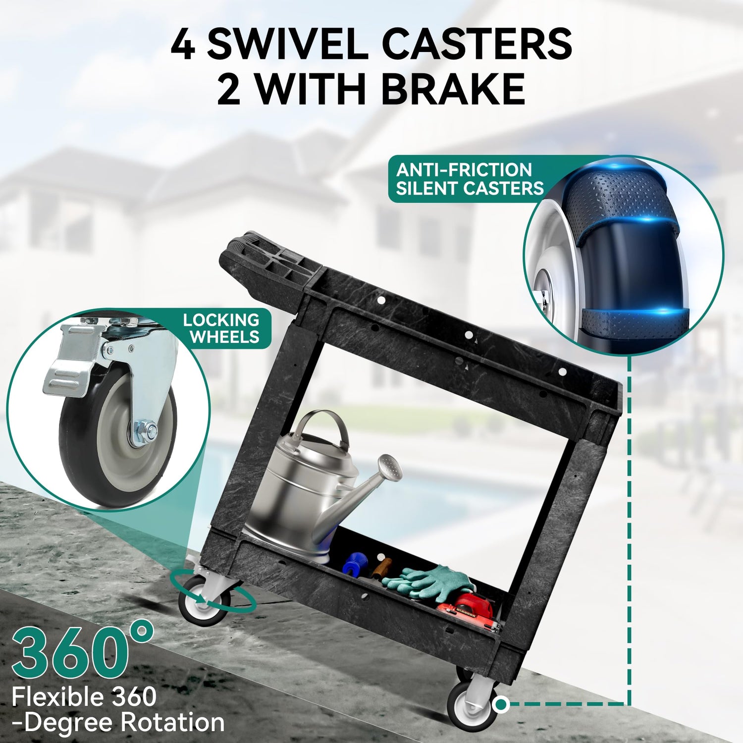 YITAHOME Utility Cart on Wheels, 550 lbs Capacity Service Cart, 40 x 17 Inch Rolling Work Carts, 2 Shelf Heavy Duty Plastic Cart Suitable for Warehouse, Garage, School & Office, Cleaning, Black