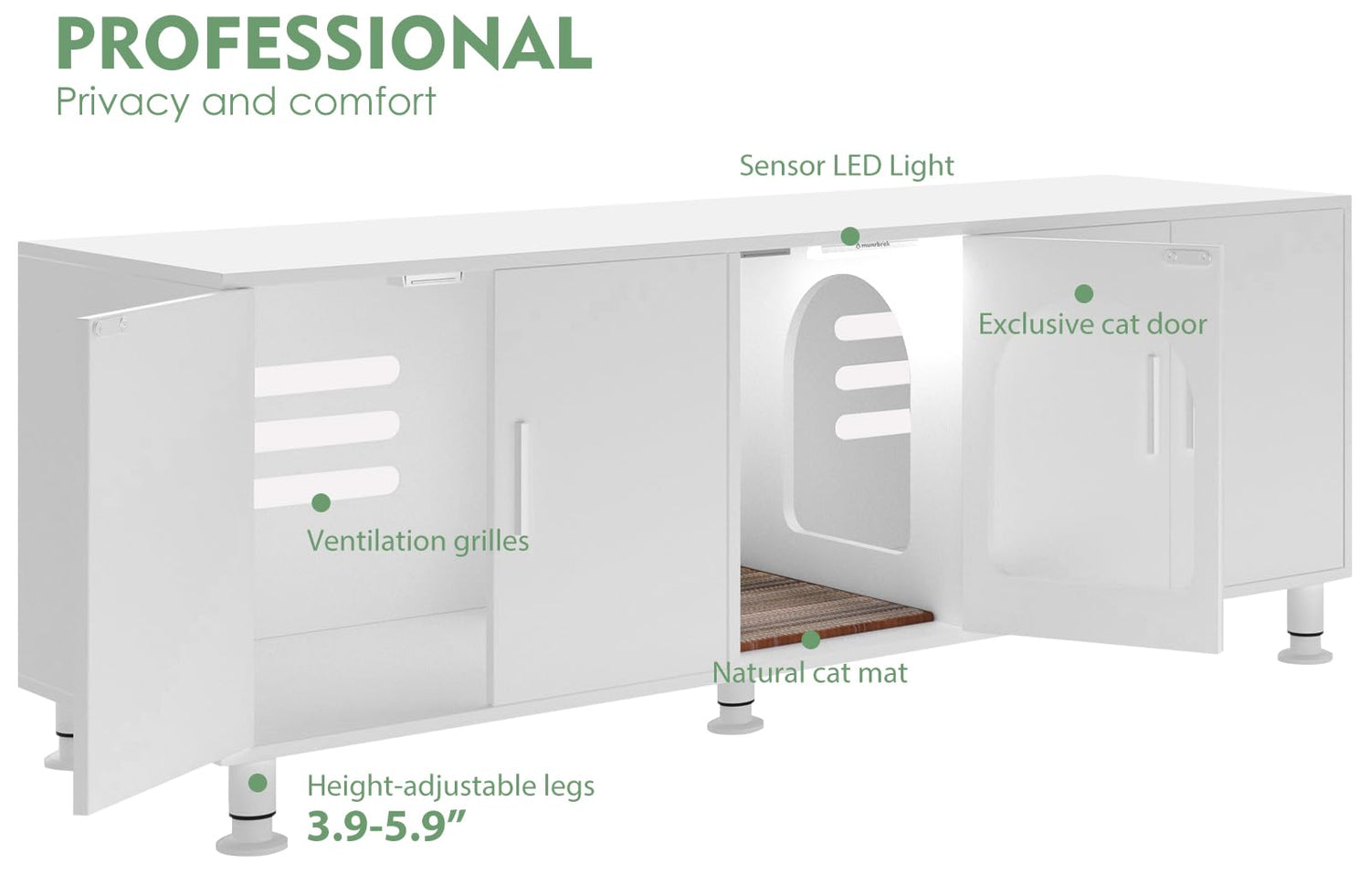 Amunrbrek Double Litter Box Enclosure, Litter Box Enclosure for 2 Litter Boxes, Modern Litter Box Furniture for 2 Cats, with Cat Door & Motion Light (White)